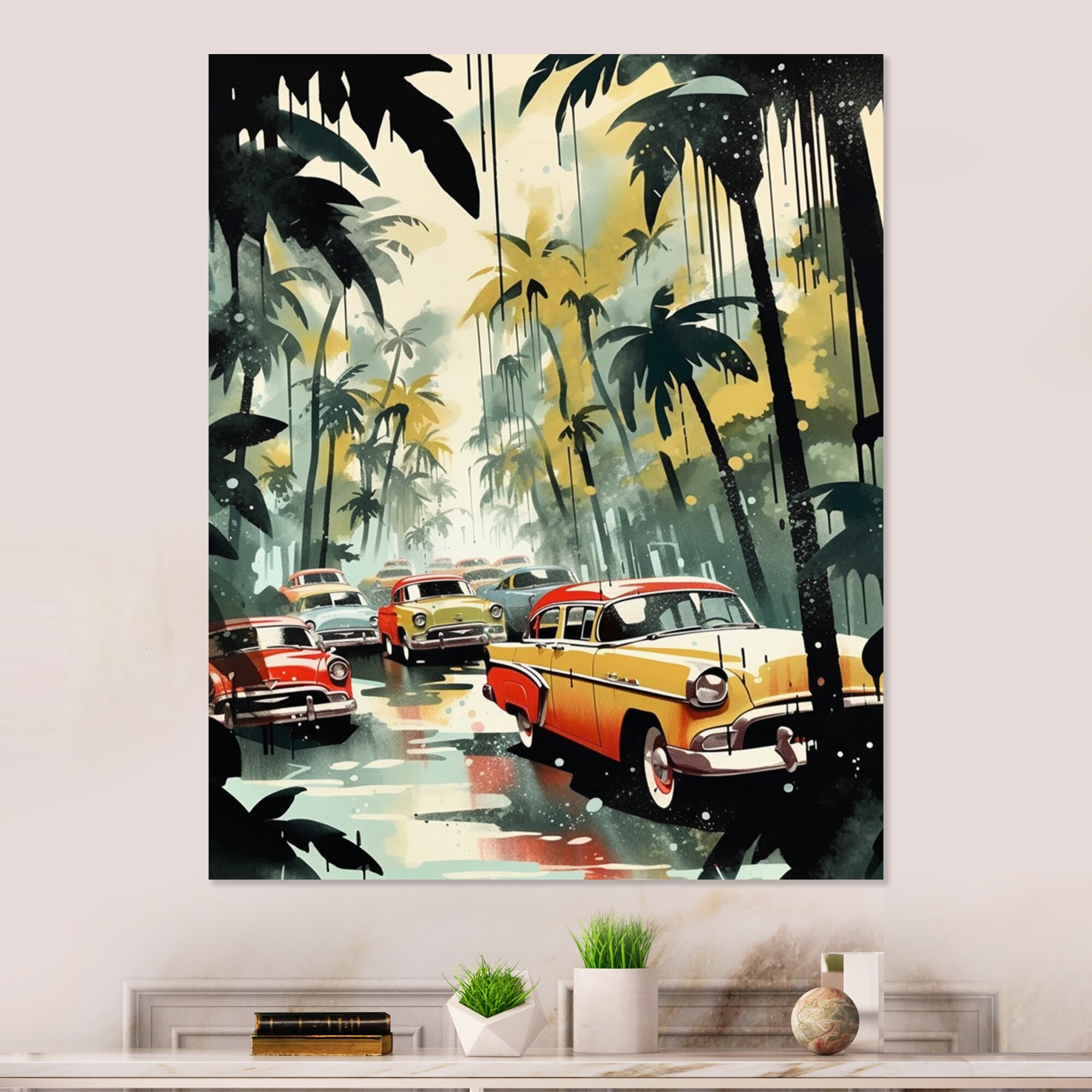 Designart "Yellow And Black Cars in Tropical Paradise" Retro Car Metal Wall Art