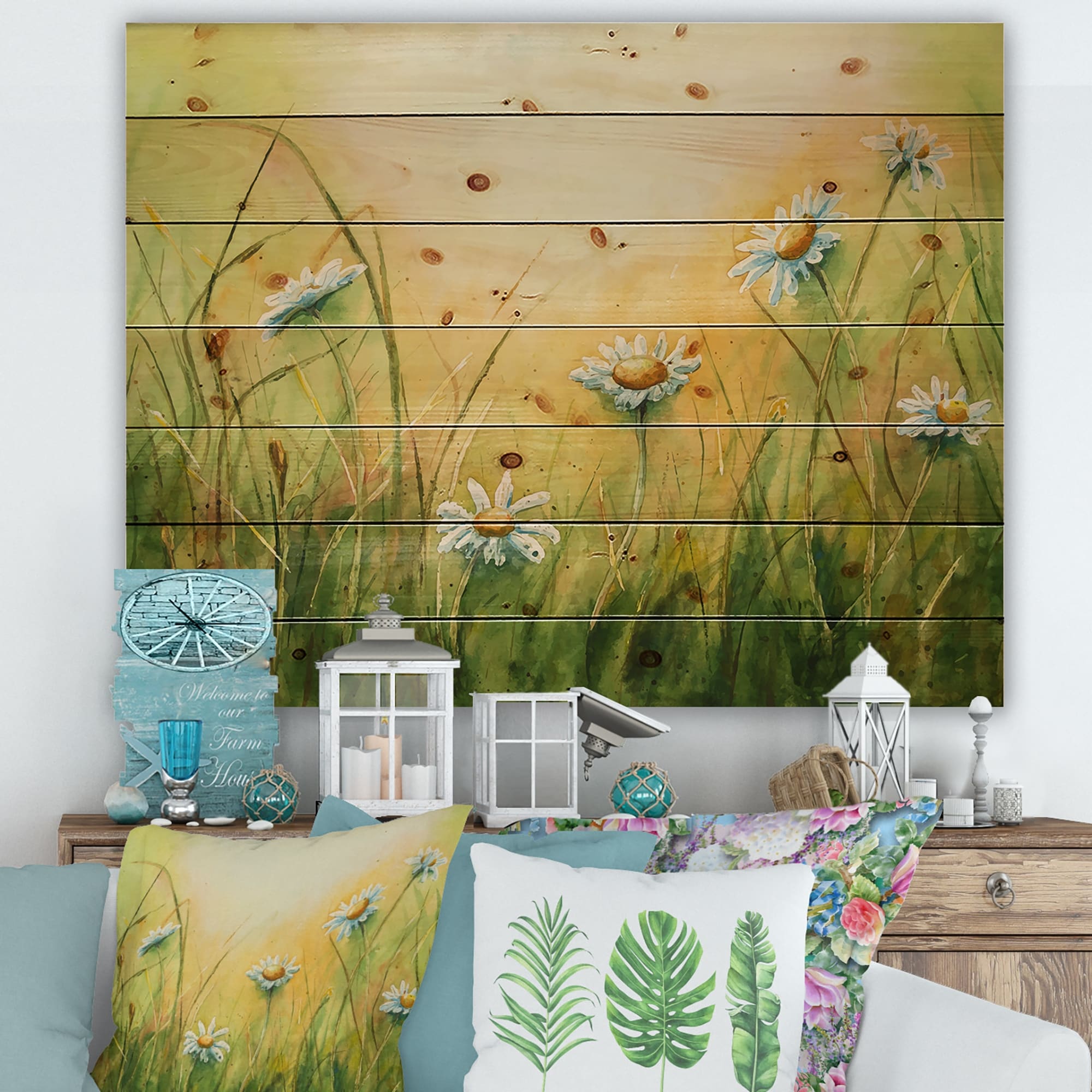 Designart 'Sunset Field With Chamomiles and Herbs' Traditional Print on Natural Pine Wood