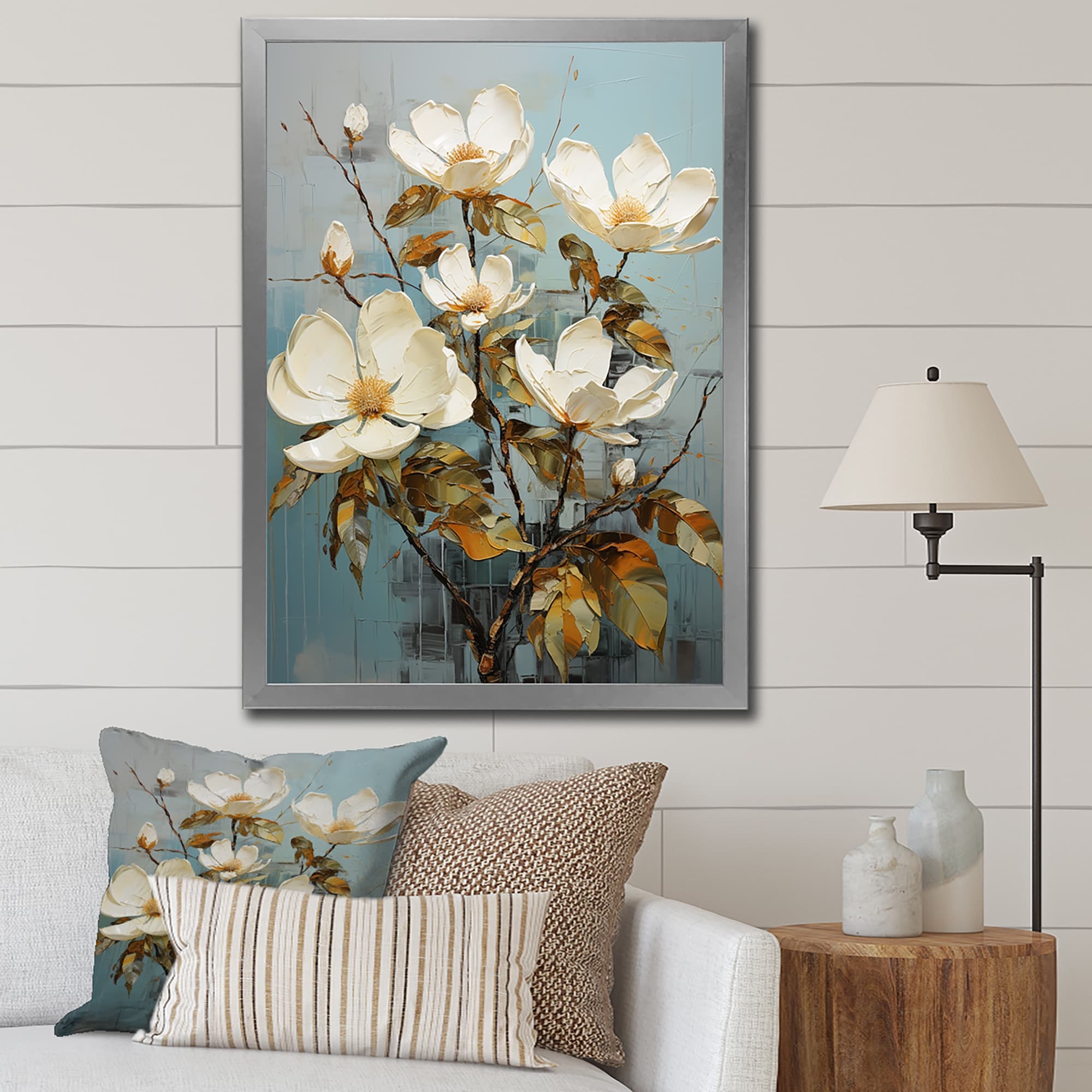 Designart "White Green Magnolias Southern Charm Patchwork" Magnolias Framed Canvas Art Print