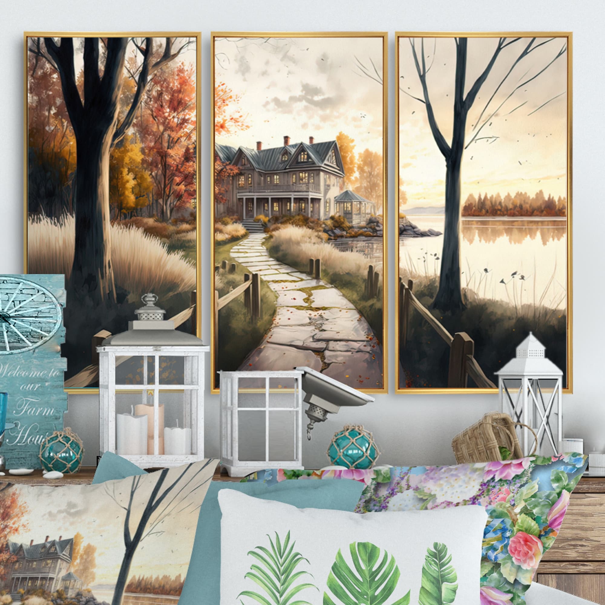 Designart "Charming Boat House III" Farmhouse / Country Framed Canvas Art Print - 3 Panels