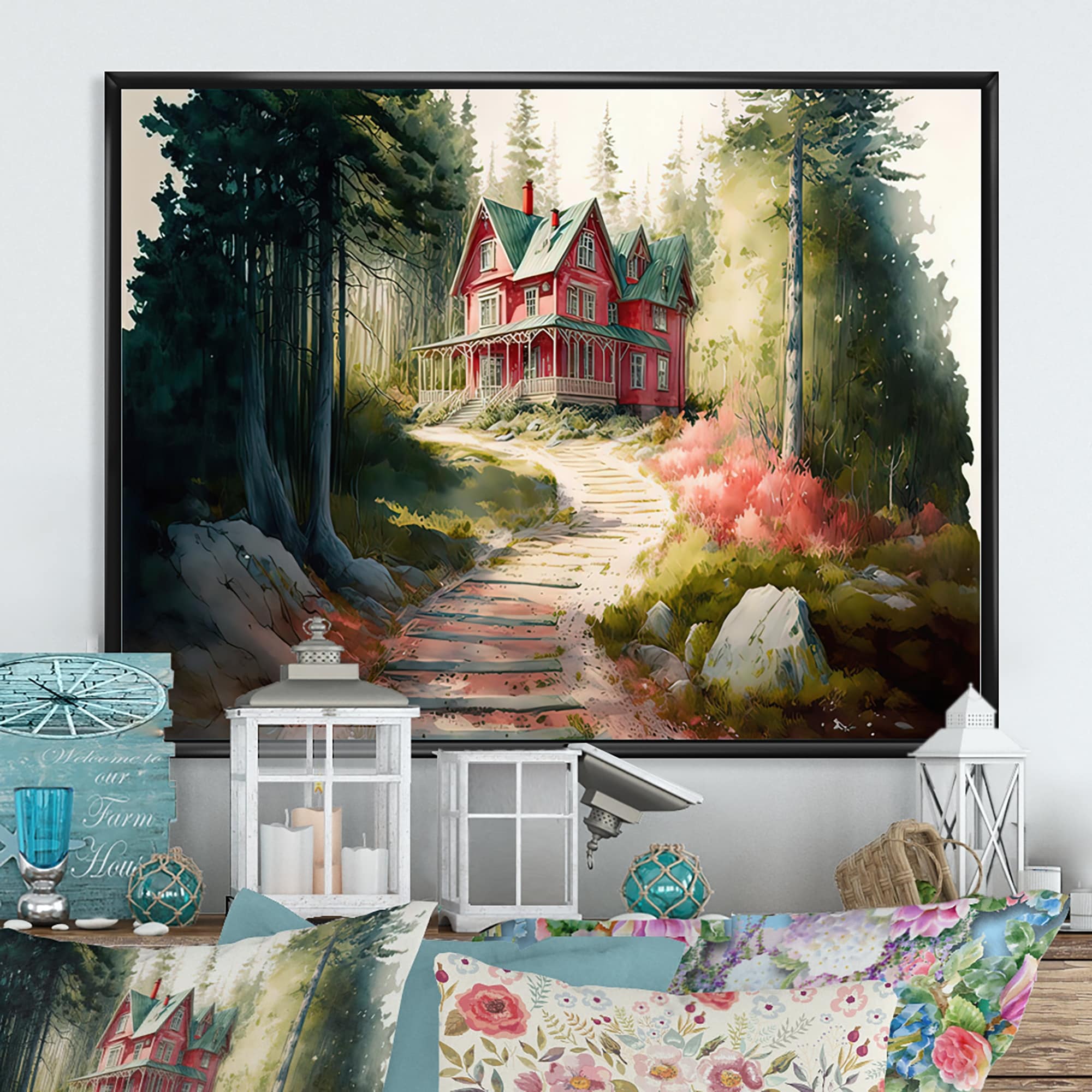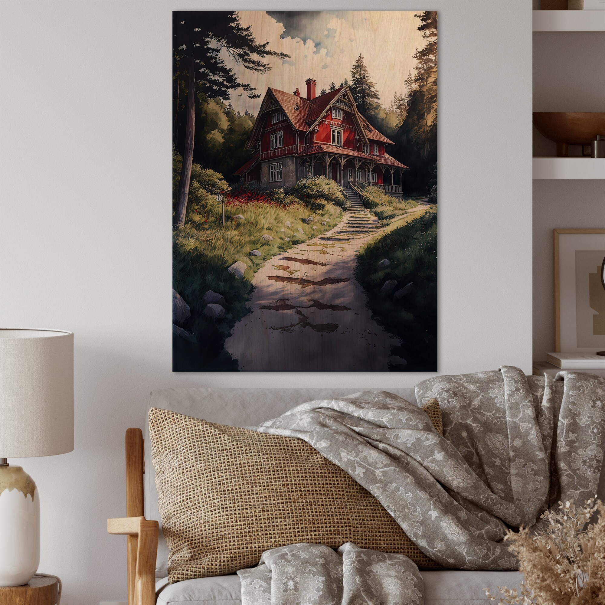 Designart "Charming Cabin And Path I" Farmhouse / Country Canvas Wall Art