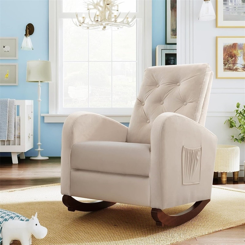 Velvet Rocking Chair with Side Pocket, Comfy Accent Chair with High Back, Upholstered Nursery Rocking Lounge Chair