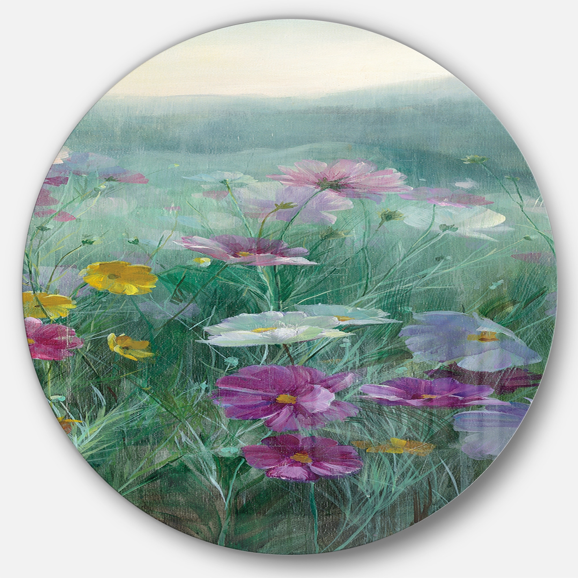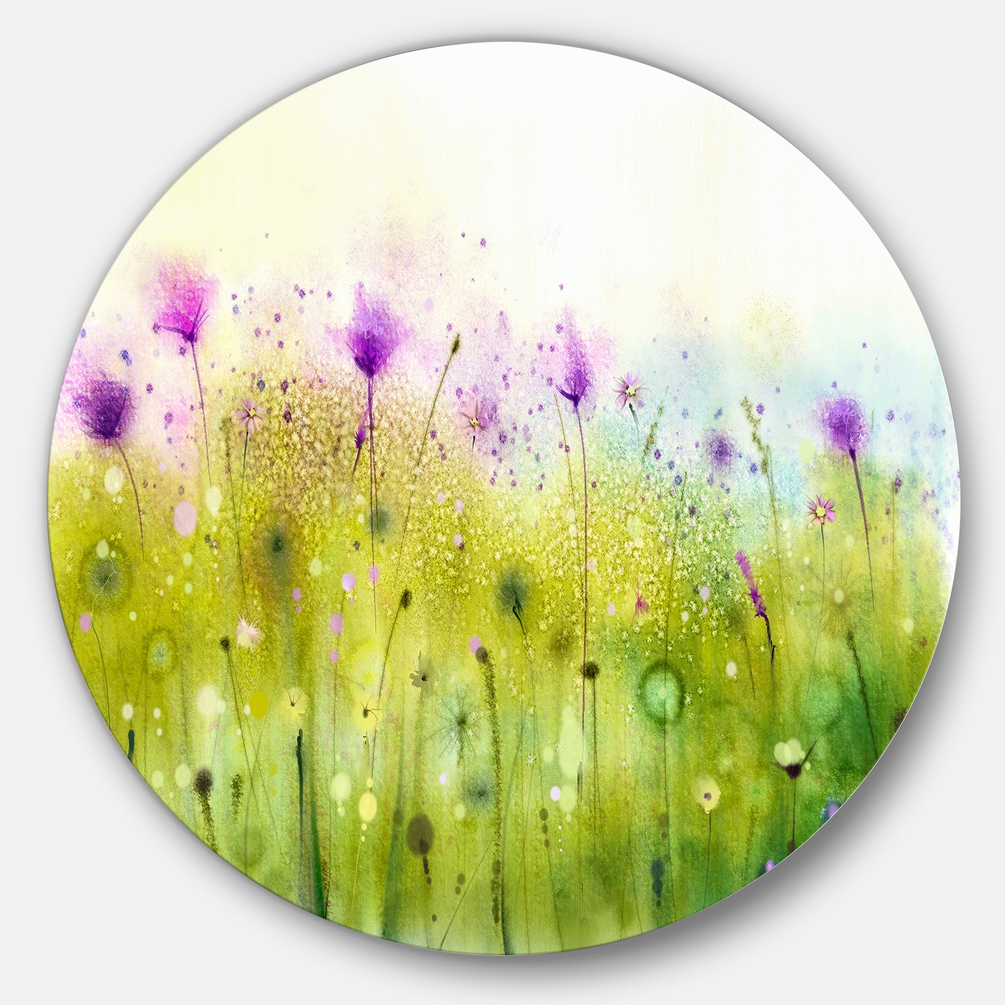 Designart 'Green Purple Abstract Cosmos of Flowers' Flower Round Wall Art