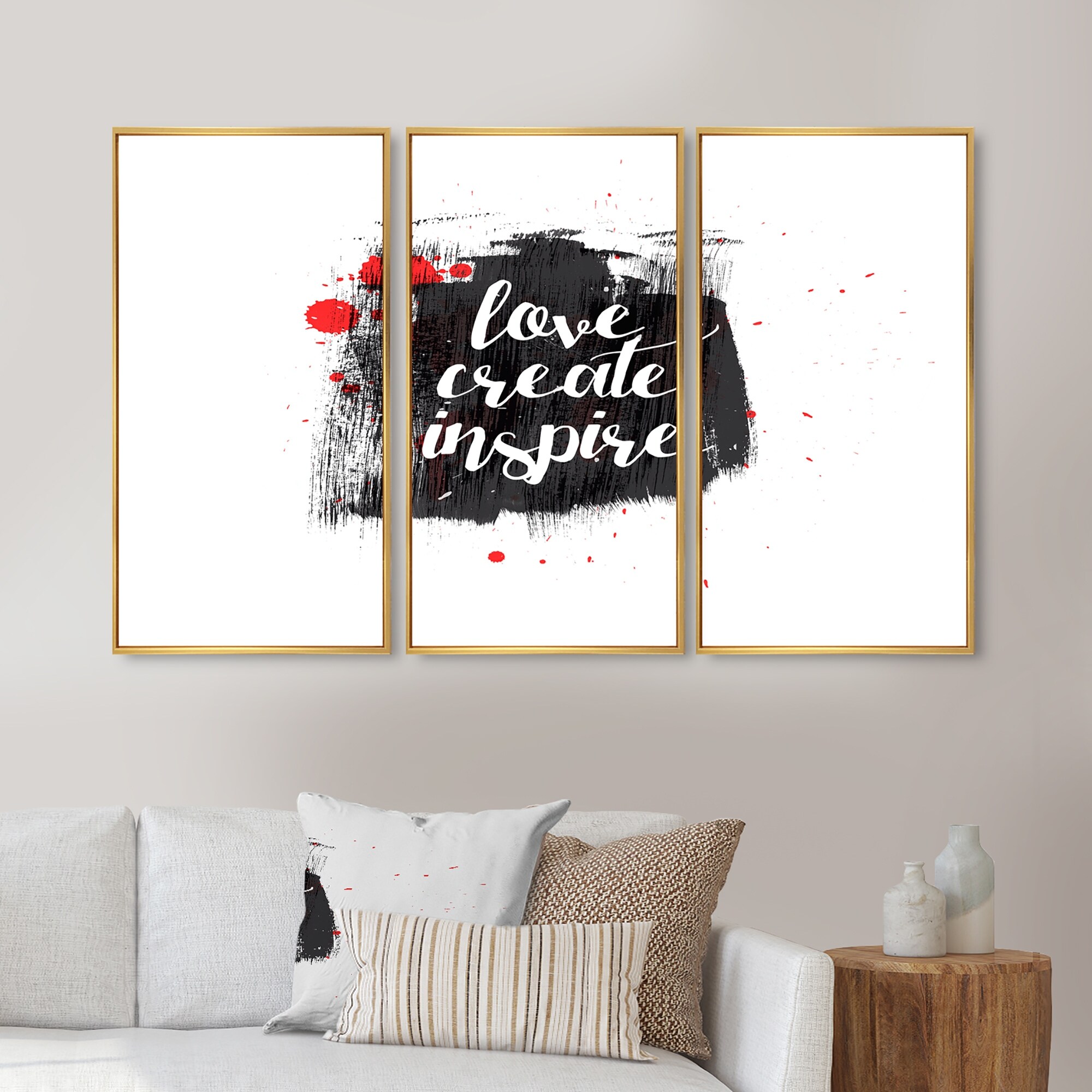 Designart "Love Create Inspire" Traditional Framed Canvas Wall Art Set of 3 - 4 Colors of Frames