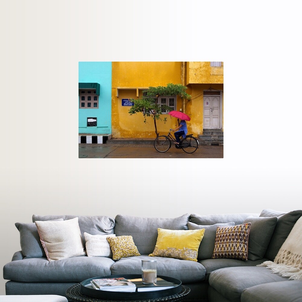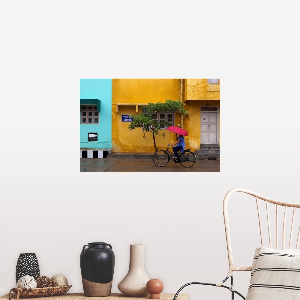 "Woman cycling in Pondicherry street with umbrella." Poster Print - Multi