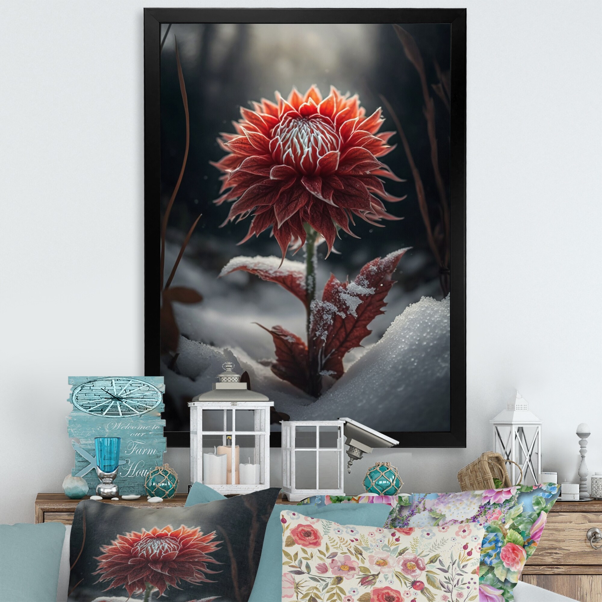 Designart "A Blooming Red Dahlia Flower in Winter II" Floral & Botanical Framed Canvas Art Print