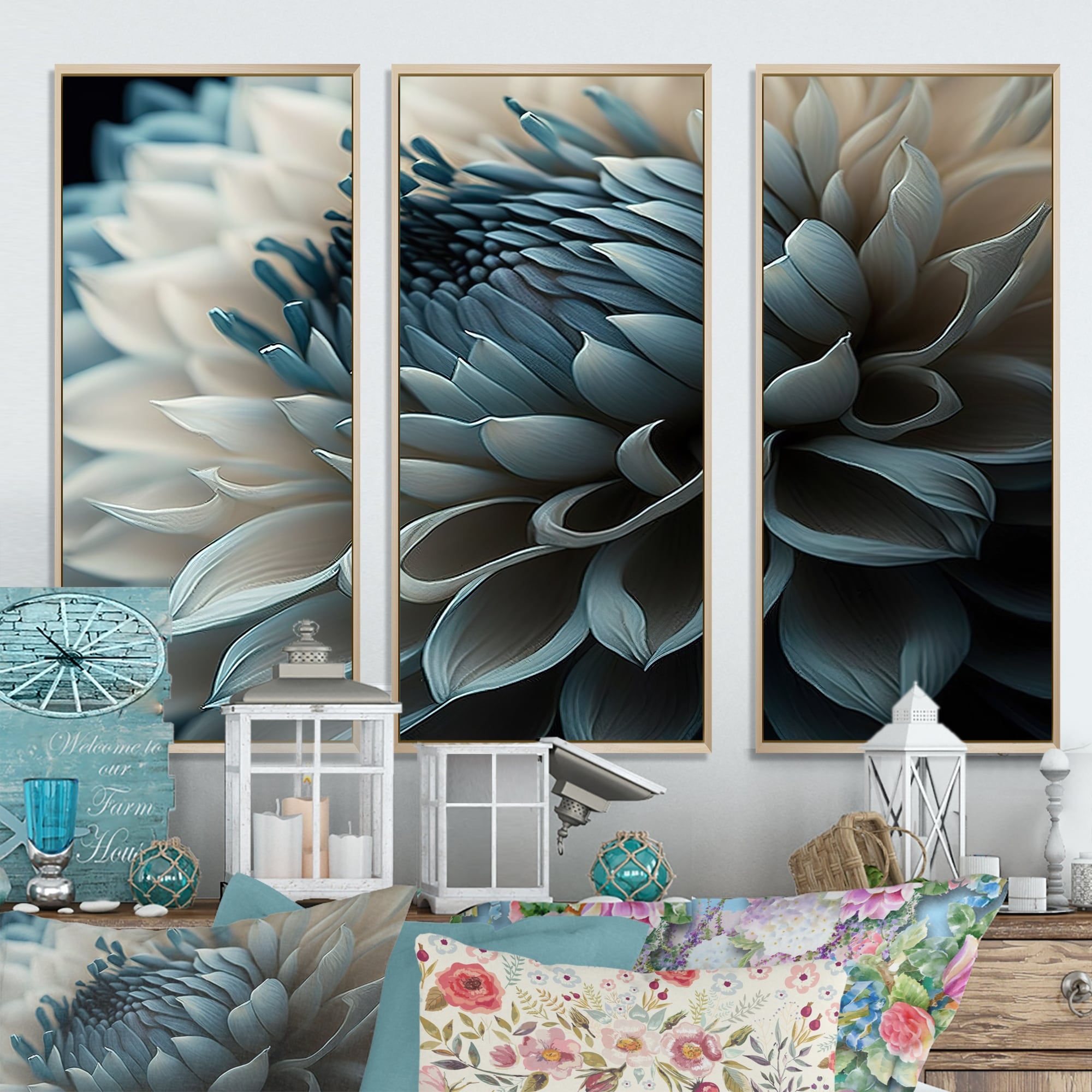 Designart "Dahlia Flowers Blue And White III" Floral Dahlia Framed Canvas Art Print - 3 Panels