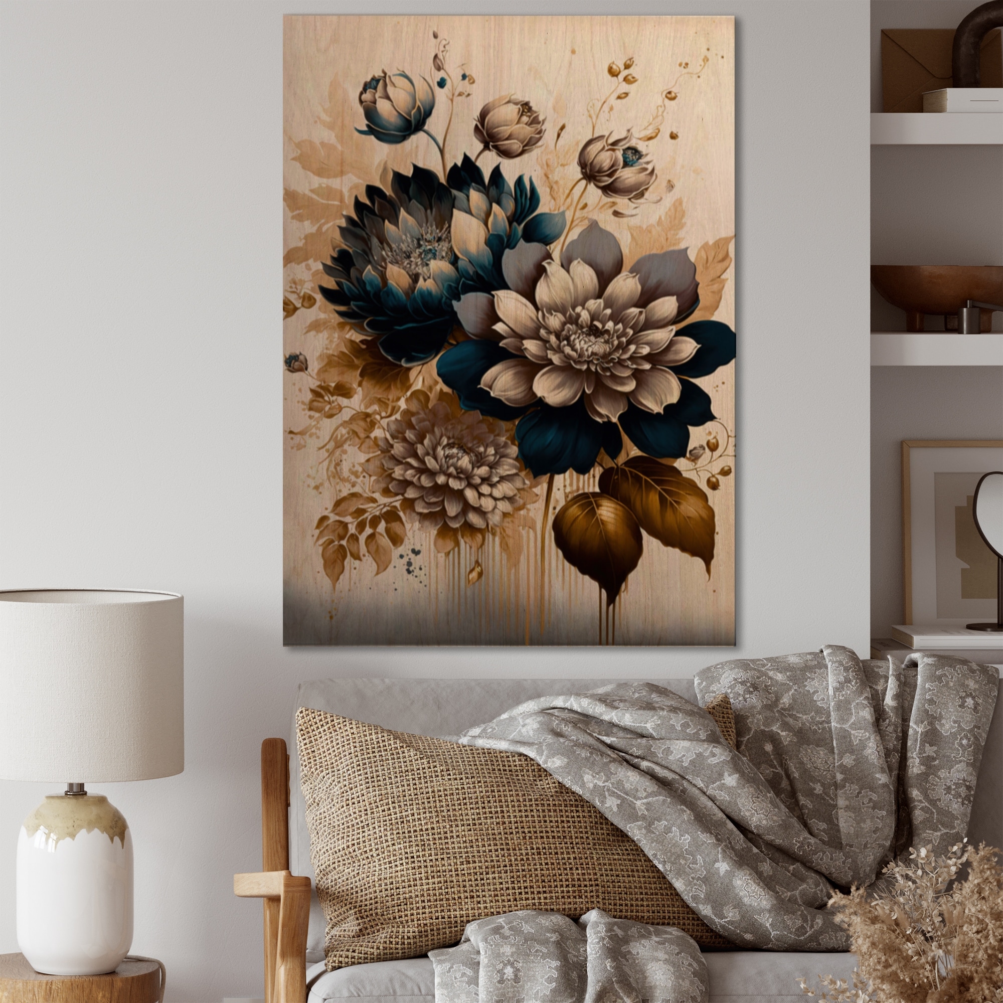 Designart 'Blue And Gold Dahlia Bunch I' Floral Dahlia Wood Wall Art - Natural Pine Wood