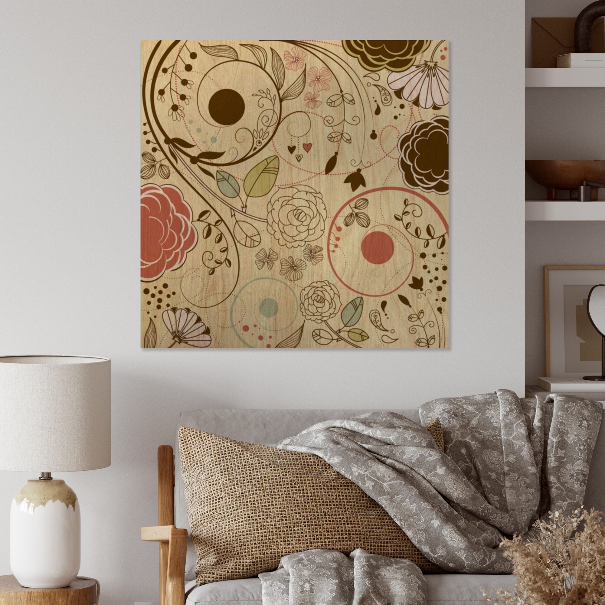 Designart 'Retro Doodles Flowers II' Traditional Wood Wall Art Décor - Natural Pine Wood