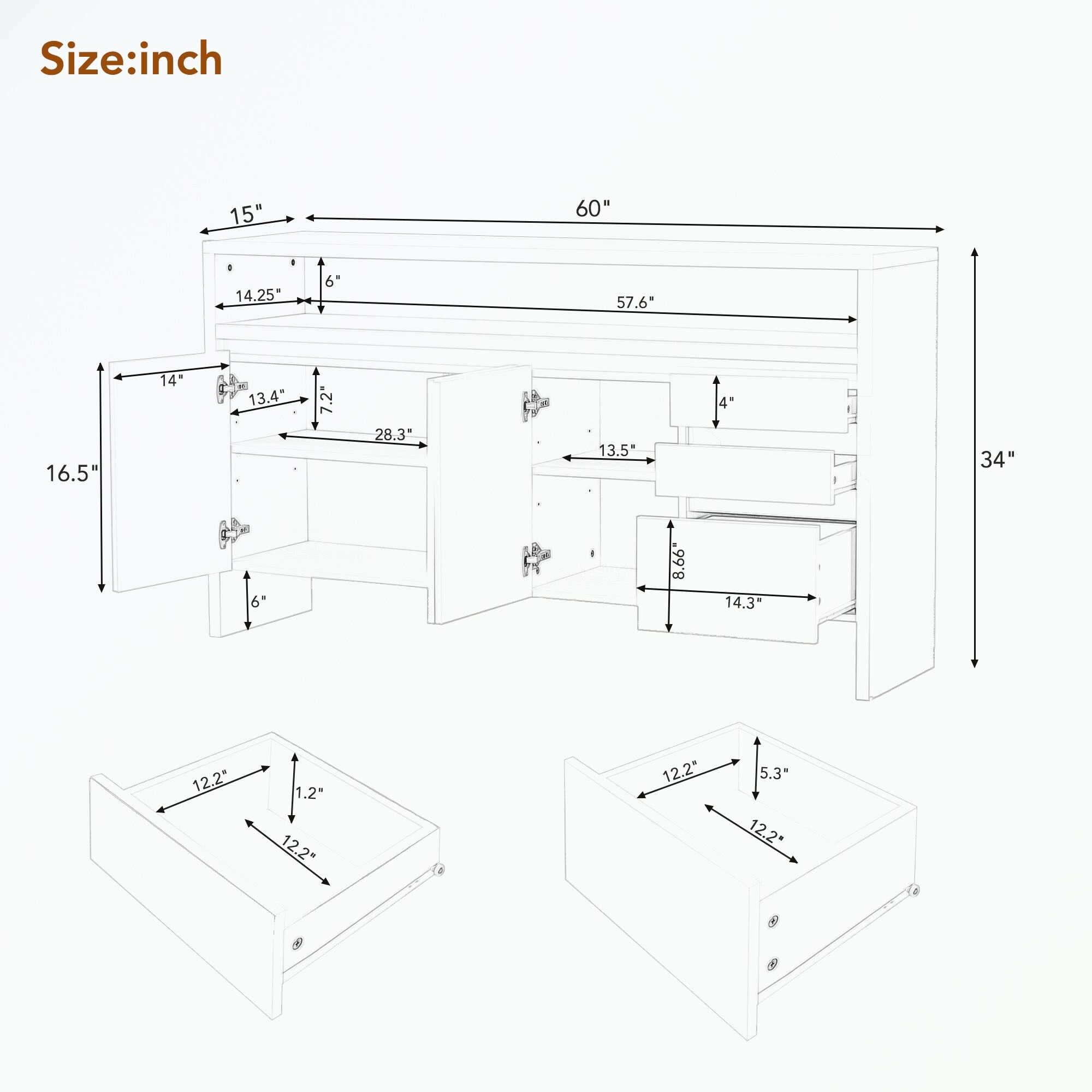Sideboard with Double-Storey Tabletop, Two Cabinets and Three Drawers