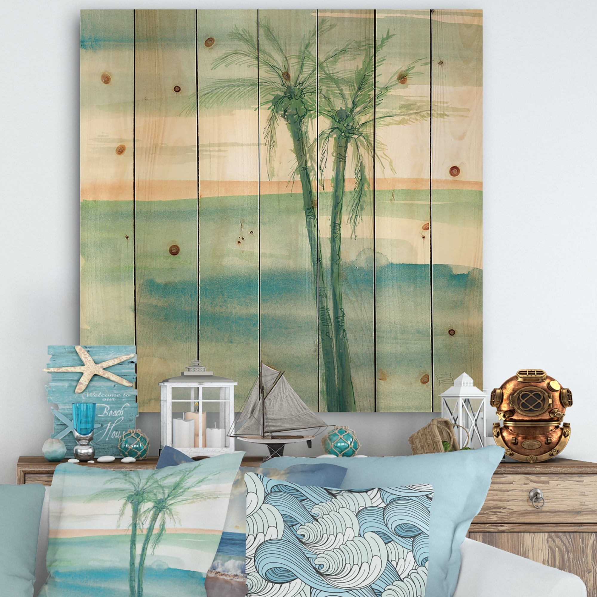 Designart 'Peaceful Dusk II Tropical' Tropical Print on Natural Pine Wood - Blue