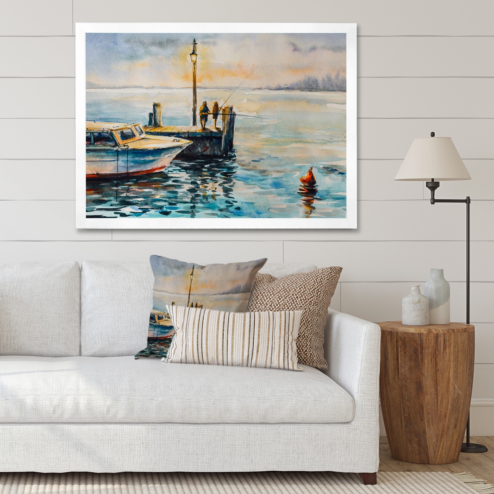 Designart "Two Men Fishing At Dusk At the Pier" Nautical & Coastal Framed Art Print