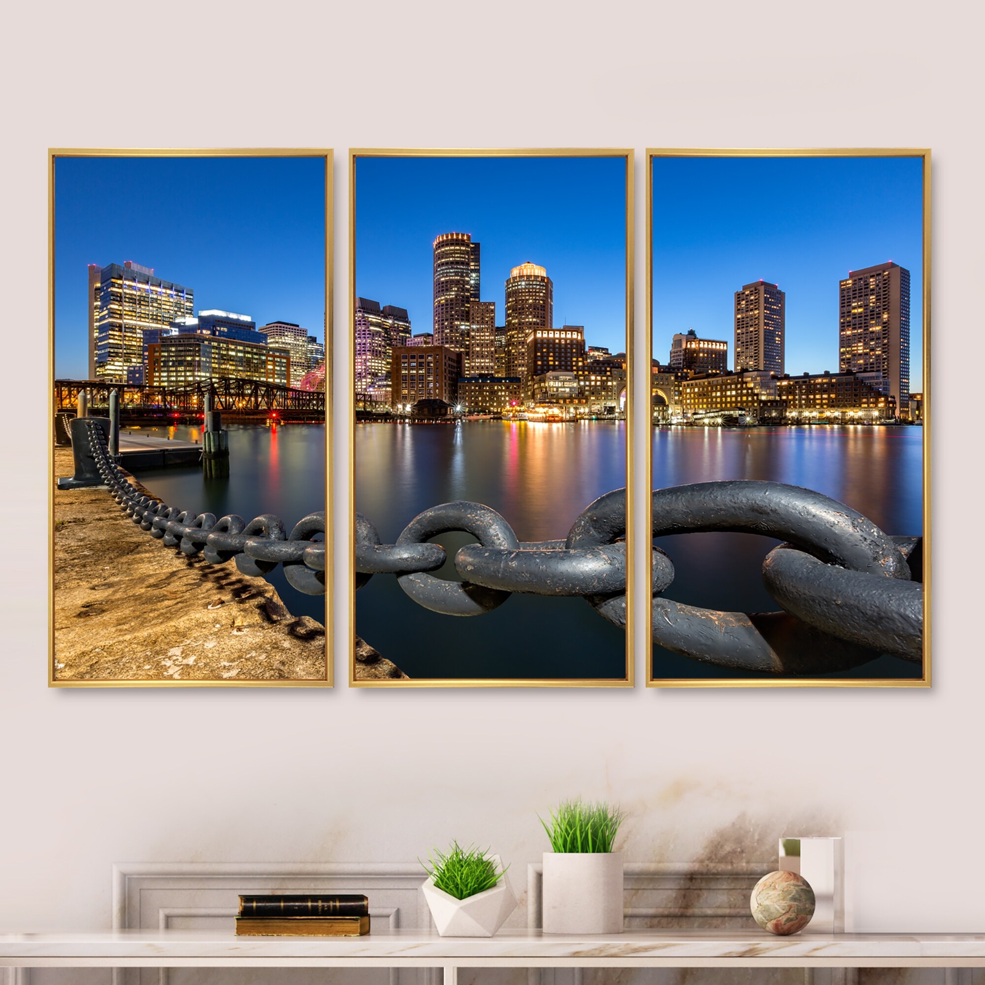 Designart "Boston Skyline at Dusk" Cityscape Framed Art Set of 3 - 4 Colors of Frames