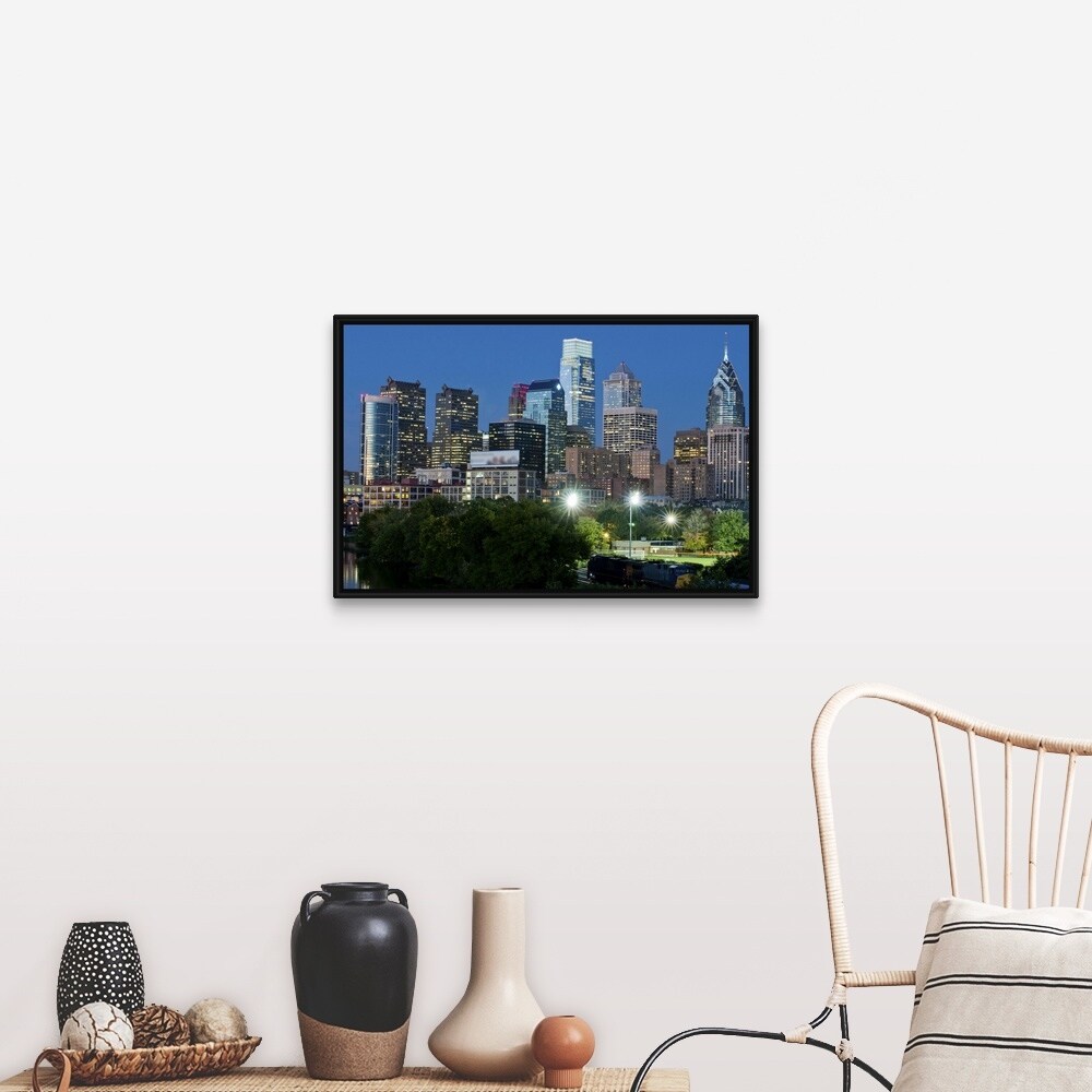 "Skyscrapers in a city at dusk, Philadelphia, Pennsylvania" Black Float Frame Canvas Art