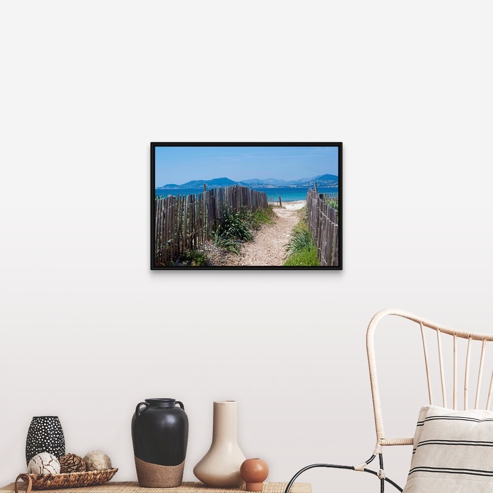 "Wooden fences on pathway that leads to the Almanarre Beach in Hyeres" Black Float Frame Canvas Art