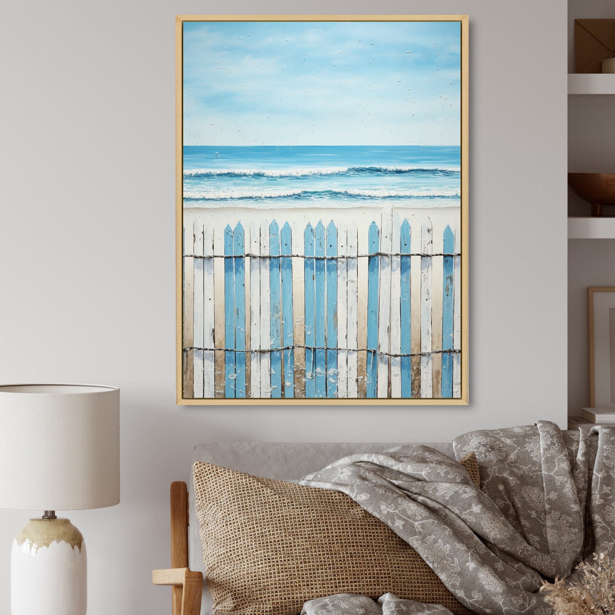 Designart "Minimalism Beach Fence" Beach Framed Wall Art Living Room