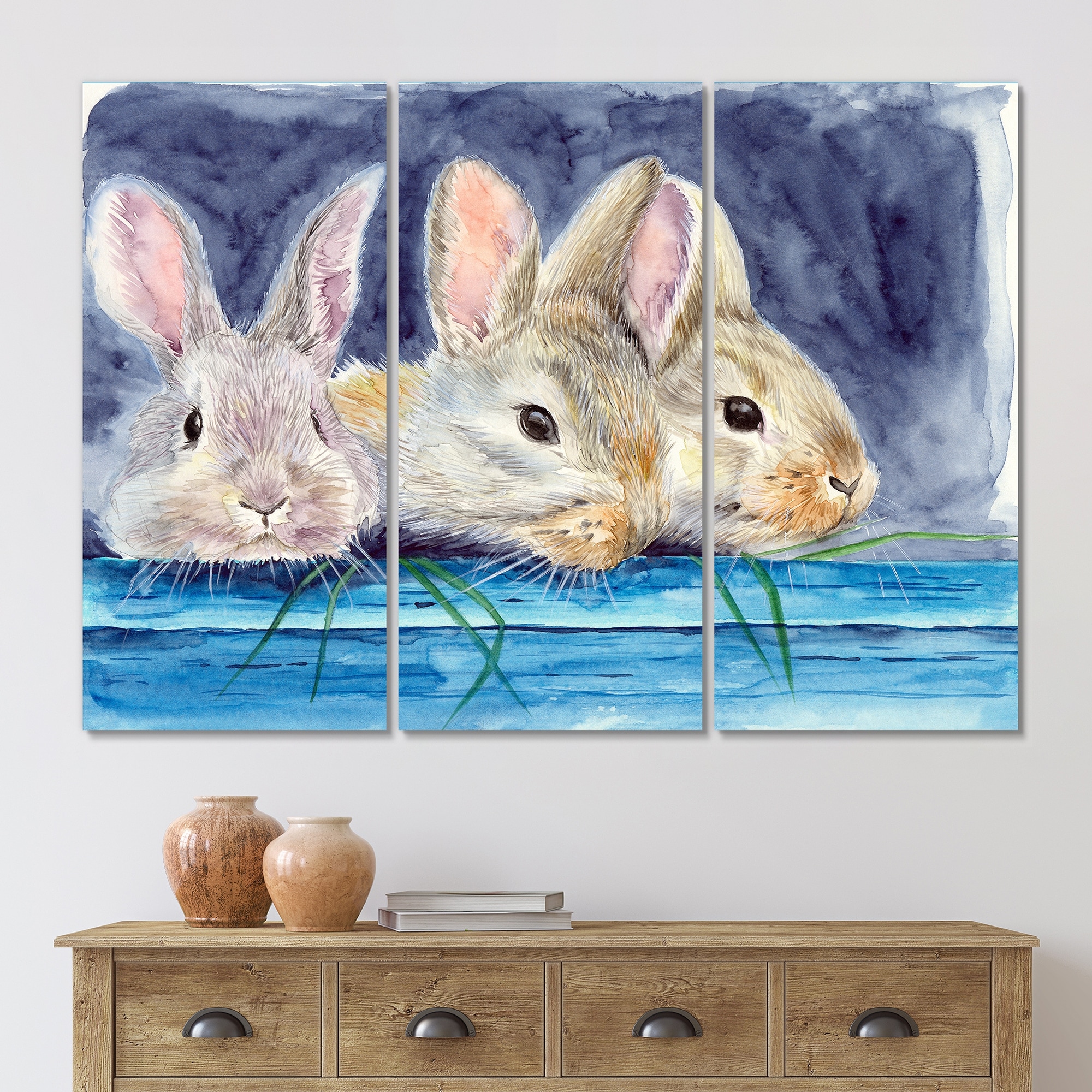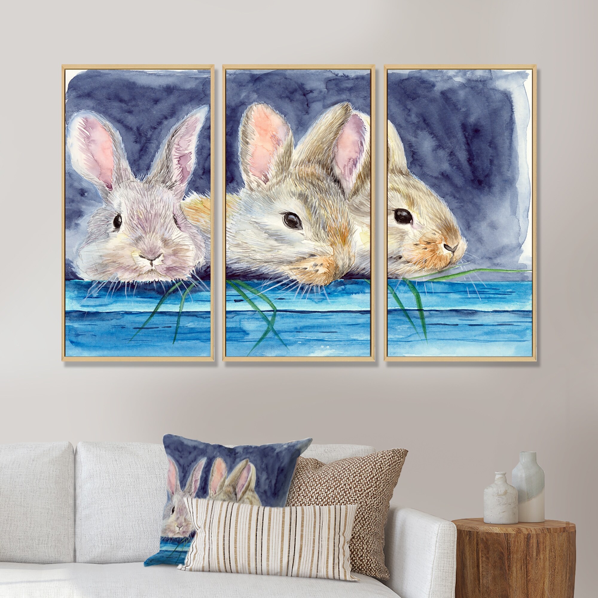 Designart "Three Fluffy Rabbits Behind A Blue Wooden Fence I" Traditional Framed Wall Art Set of 3 - 4 Colors of Frames