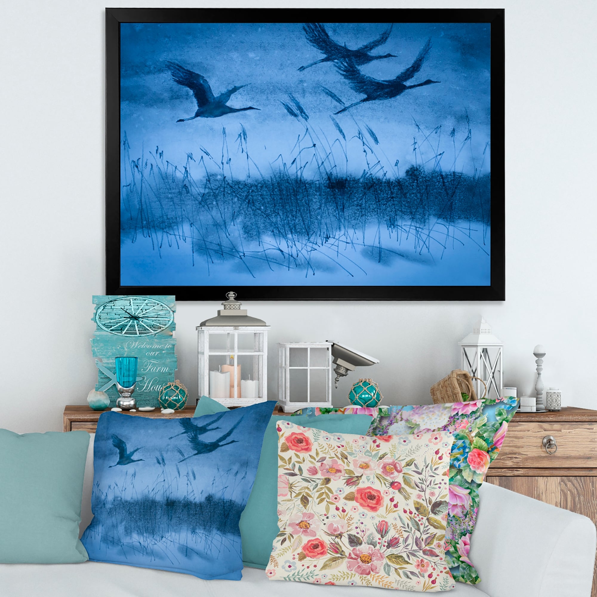 Designart "Cranes In Flight During Dark Blue Evening Light" Traditional Framed Canvas Wall Art Print