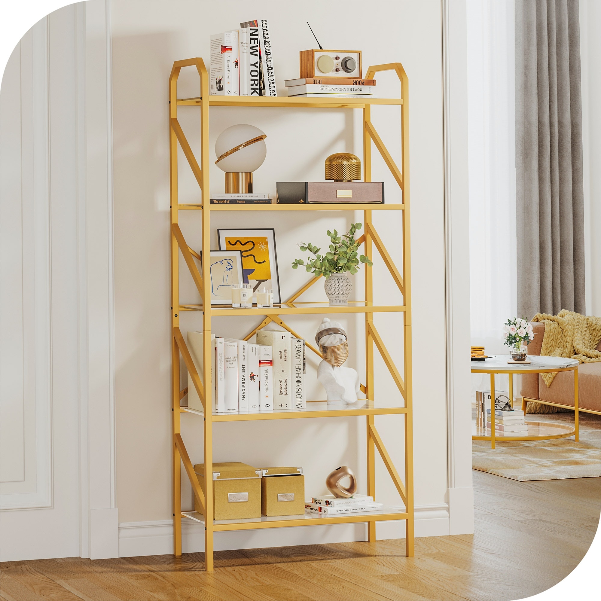 5-Tier Bookshelf 62-inch Tall Gold Metal and Glass Bookcase