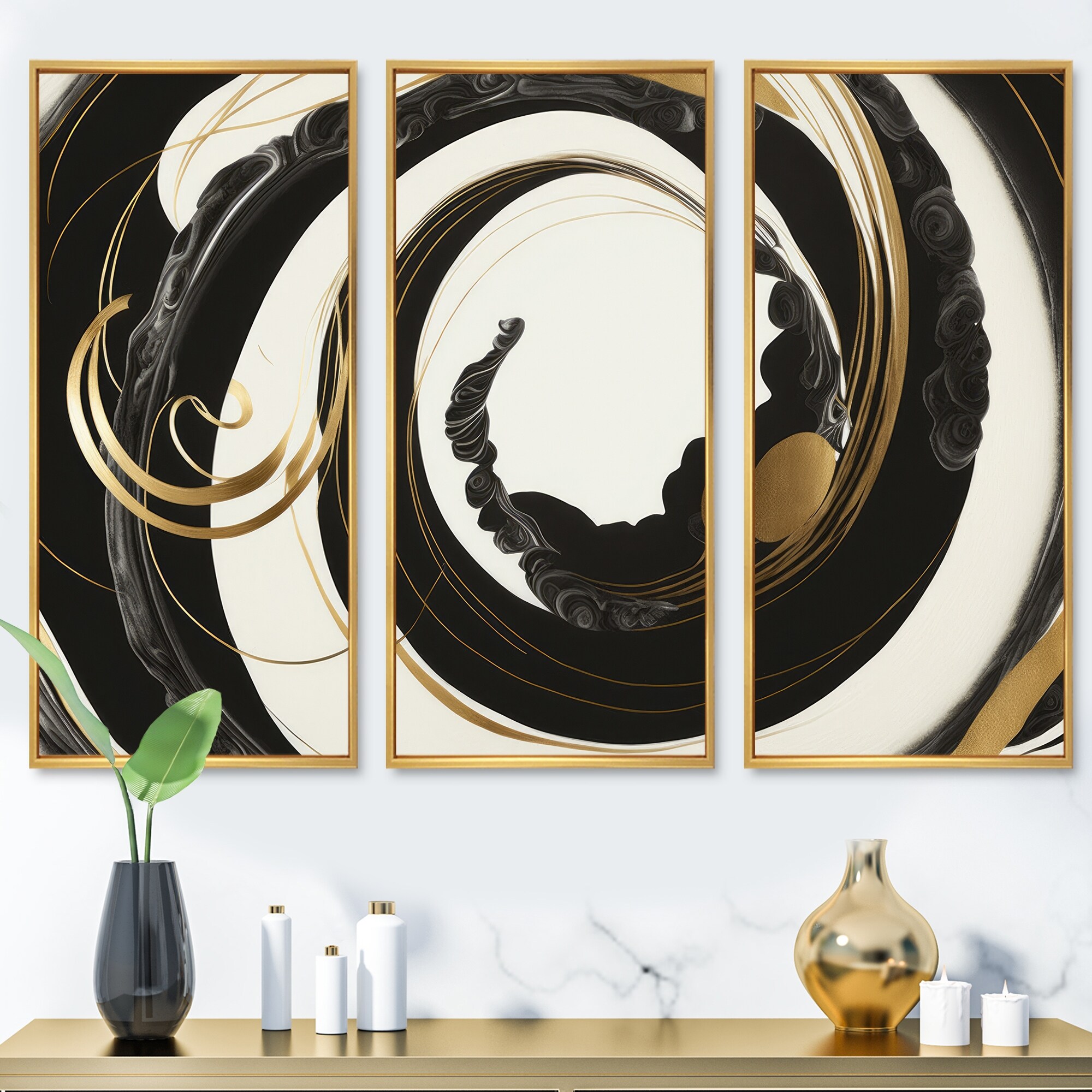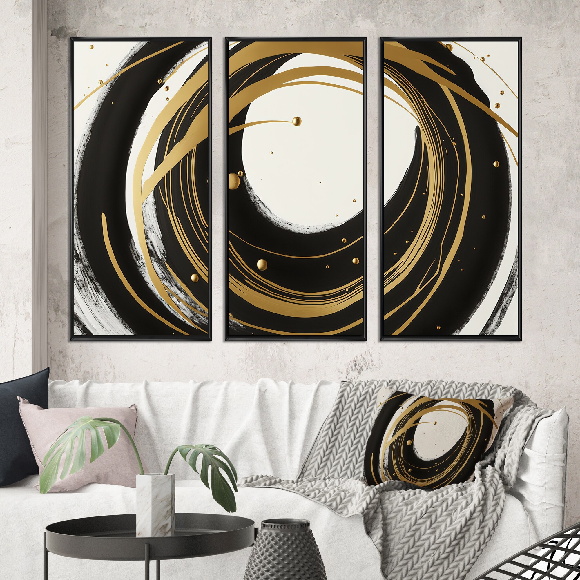 Designart "Black, Silver And Gold Blending Swirls VI" Modern Spiral Framed Canvas Art Print - 3 Panels