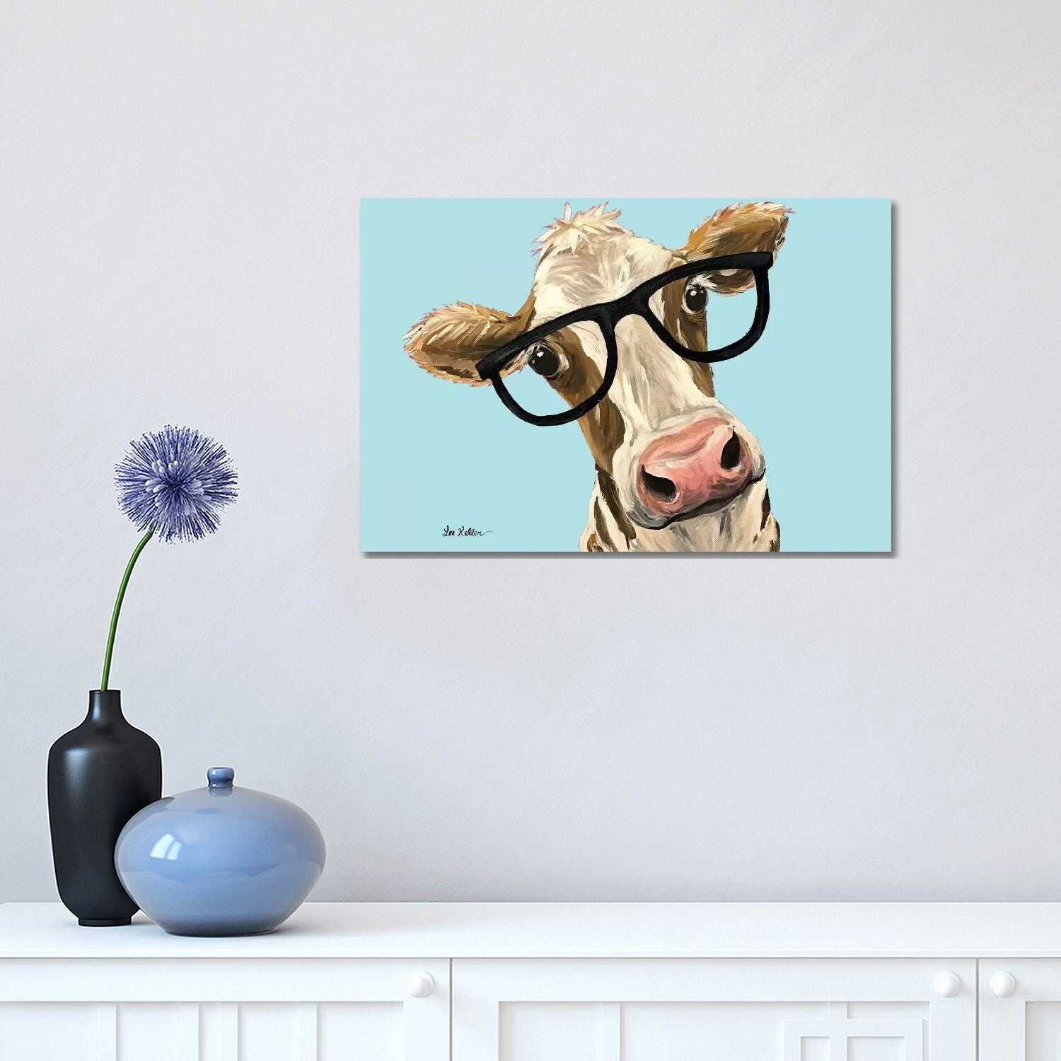 iCanvas "Cow Miss Moo Moo With Glasses on Turquoise" by Hippie Hound Studios Canvas Print