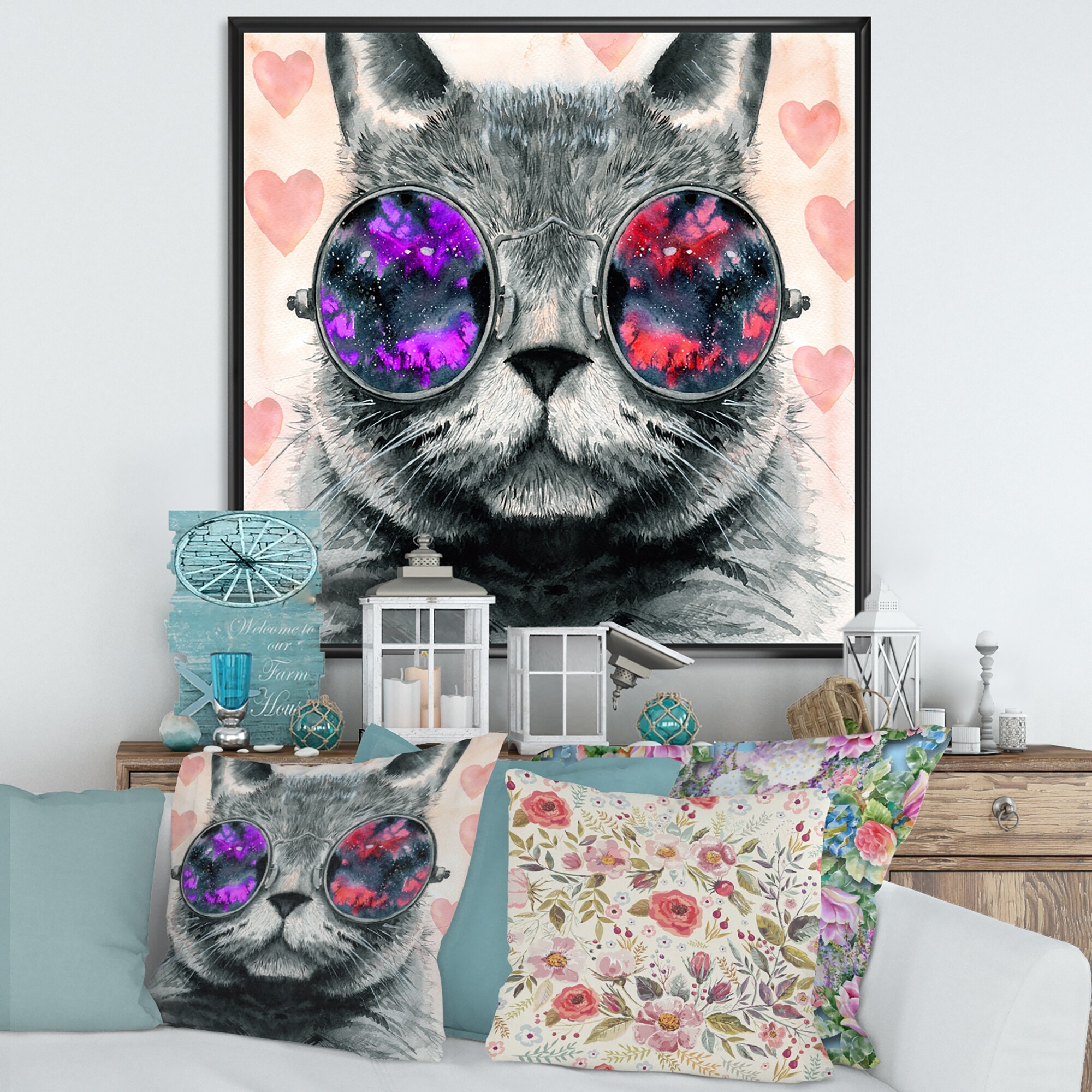 Designart "Grey Fluffy Cat in Round Hippie Glasses I" Modern Framed Canvas Wall Art Print