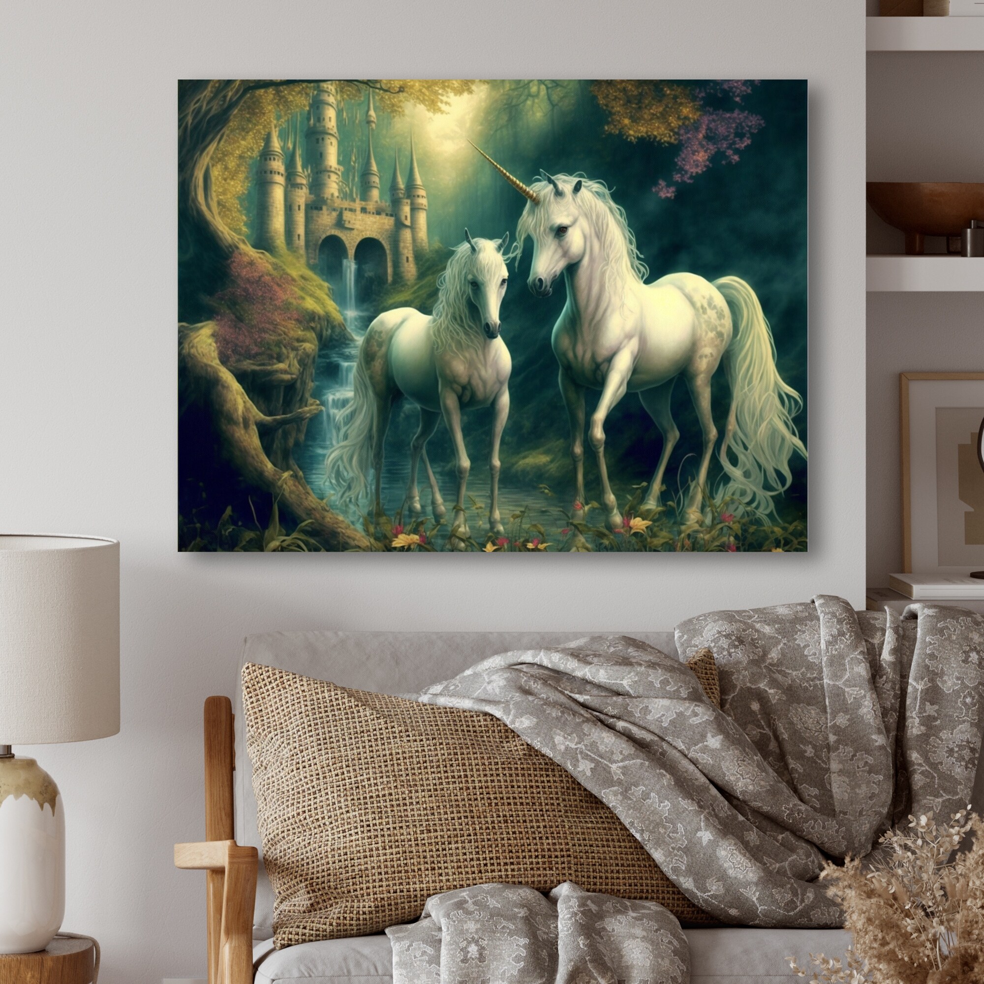 Designart "Two Gracious Unicorn in Fantasy Landscape" Animals Horse Canvas Wall Art