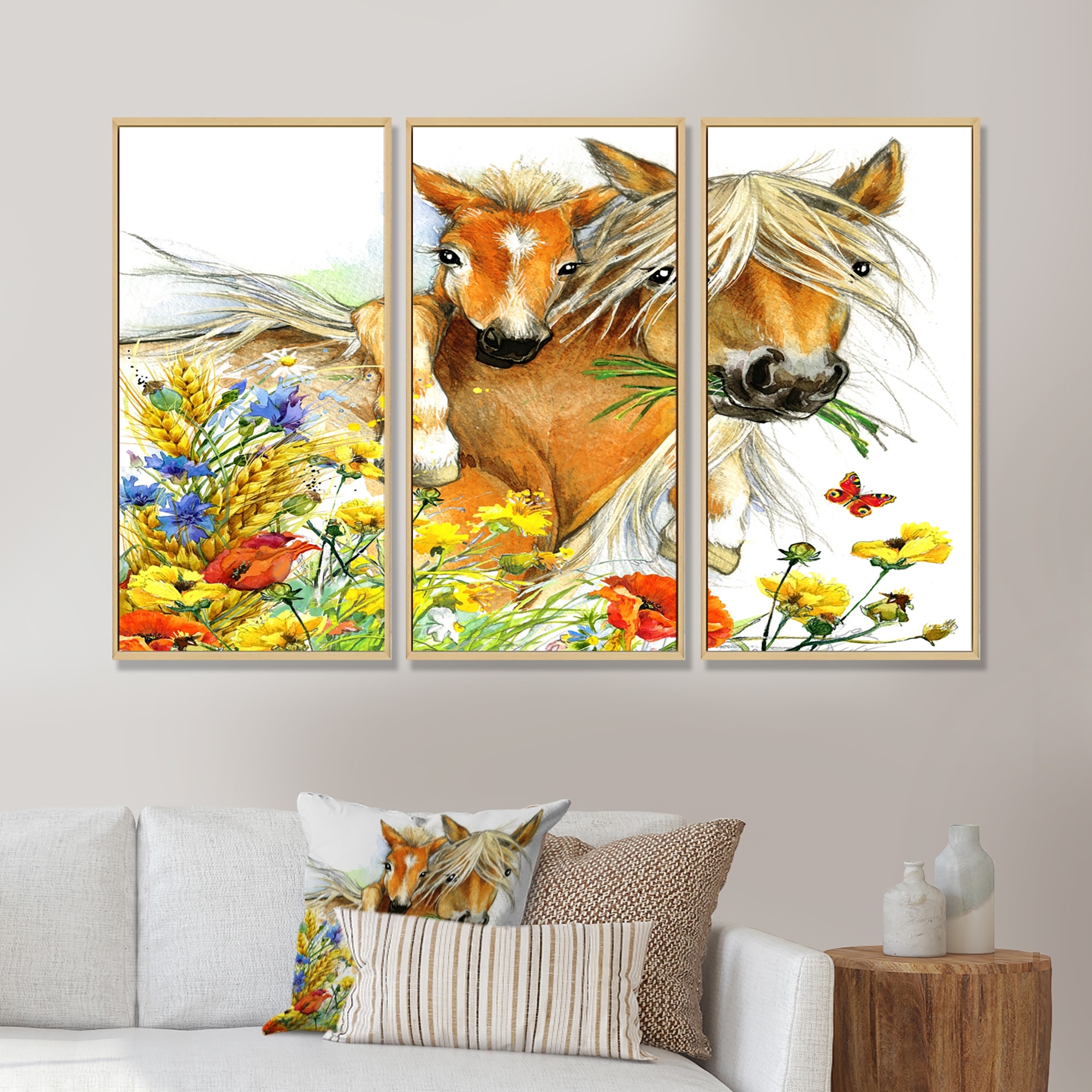 Designart "Horse and Foal with Flowers" Animal Framed Canvas Wall Art Print Set of 3 - 4 Colors of Frames