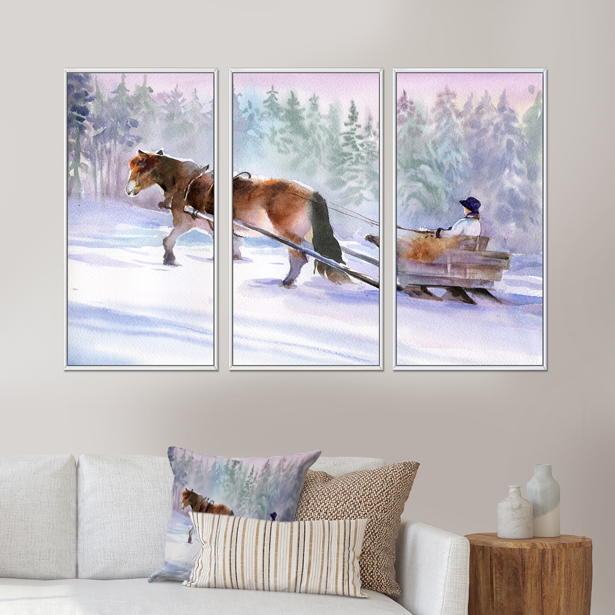Designart "Horse With A Sleigh in Snowy Landscape" Traditional Framed Wall Art Set of 3 - 4 Colors of Frames