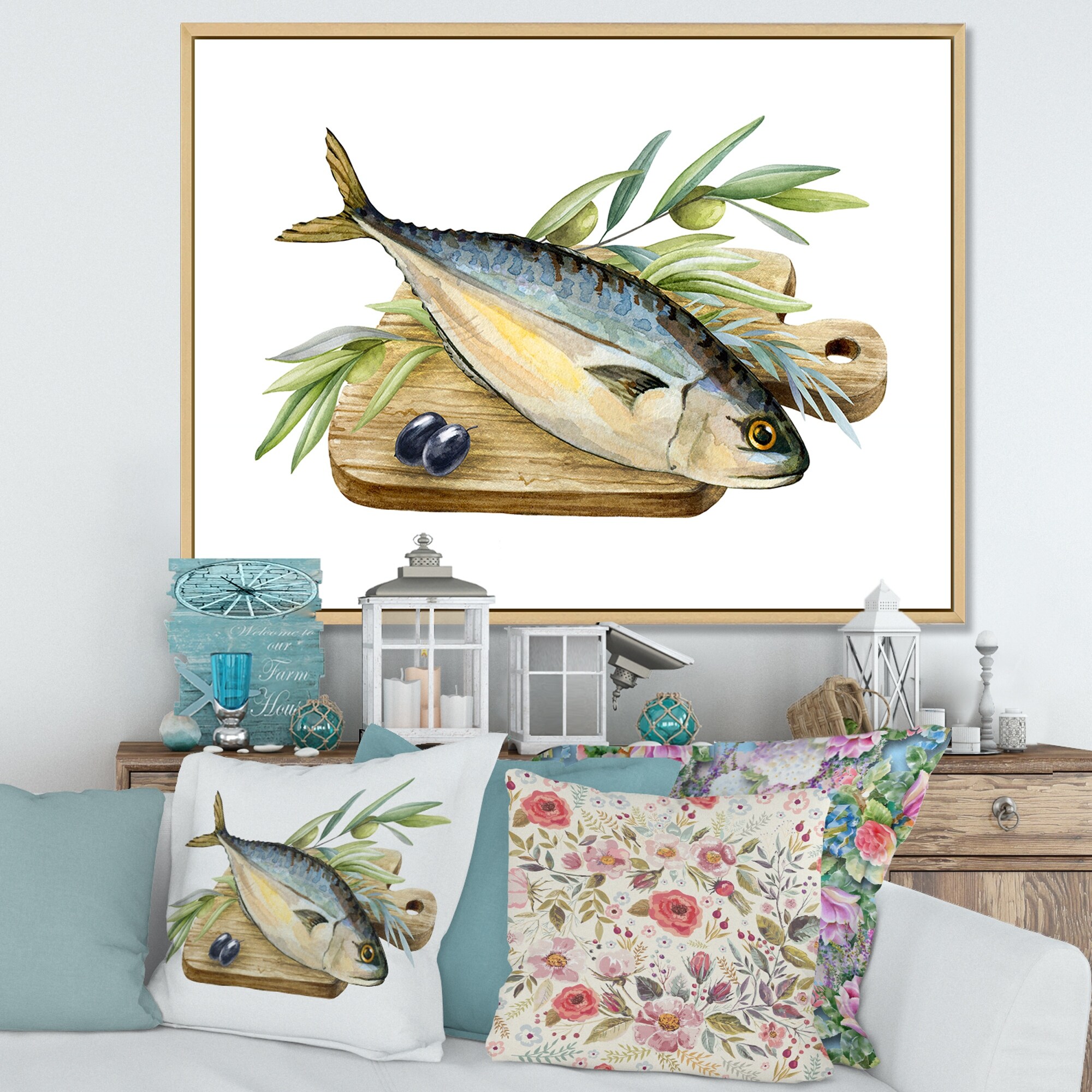 Designart "Sea Fish With Herbs And Olive Branch" Nautical & Coastal Framed Canvas Wall Art Print