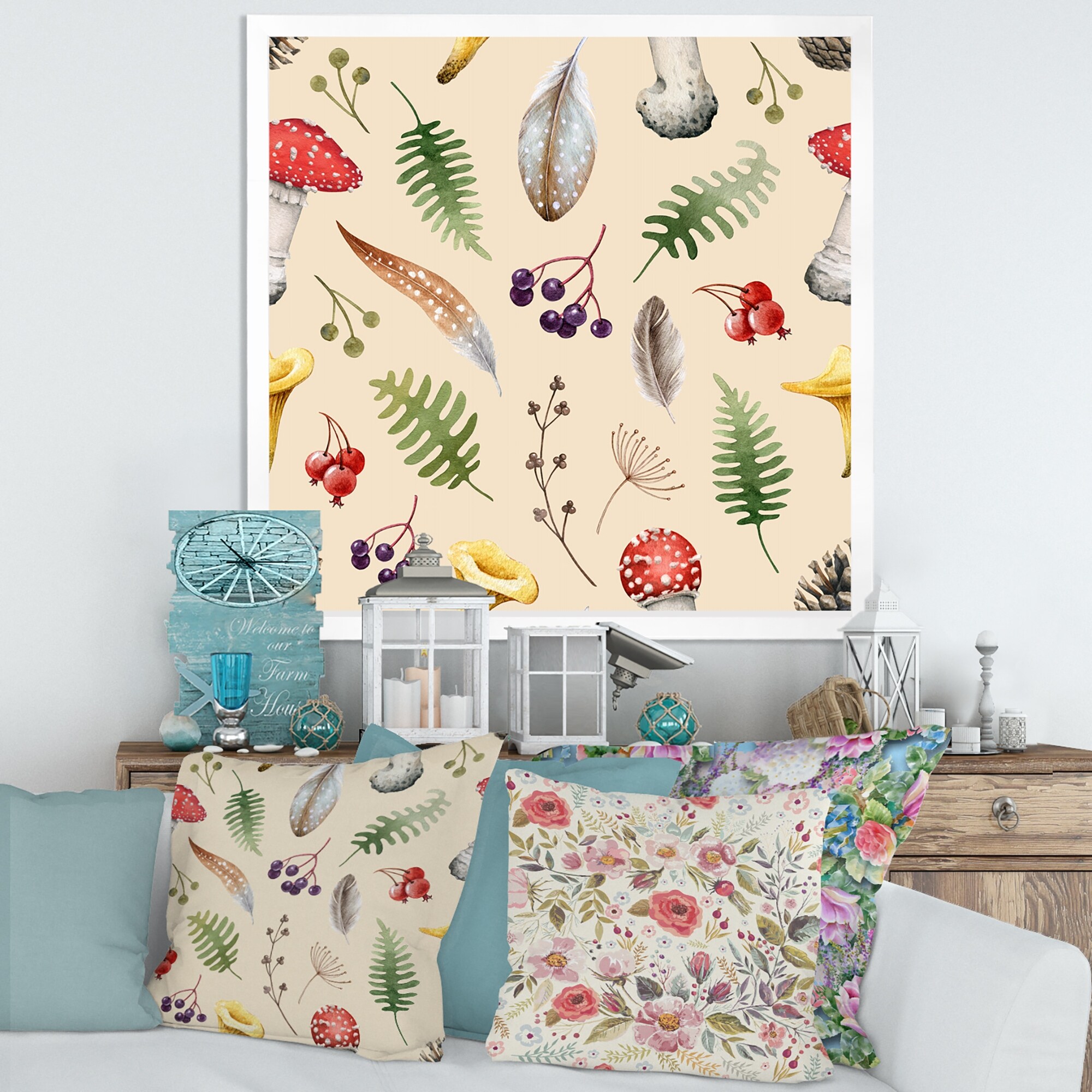Designart "Wild Forest Herbs And Mushroom on Beige" Patterned Framed Art Print
