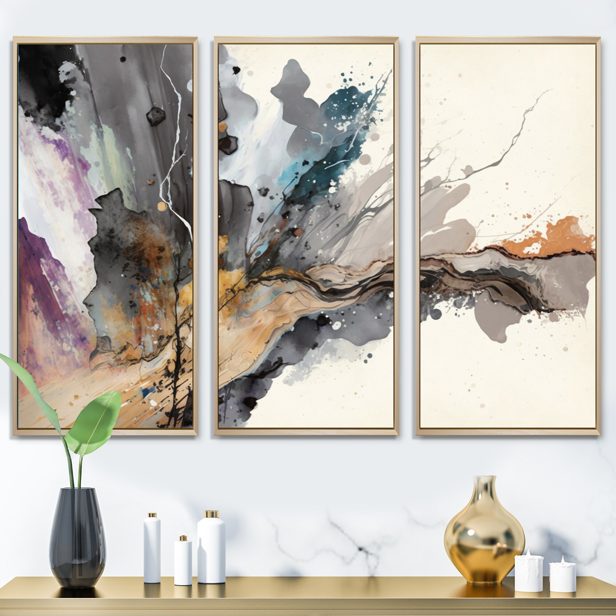 Designart "Jazz Rhythms in Shades of Gray I" Abstract Liquid Ink Framed Canvas Wall Art Print - 3 Panels