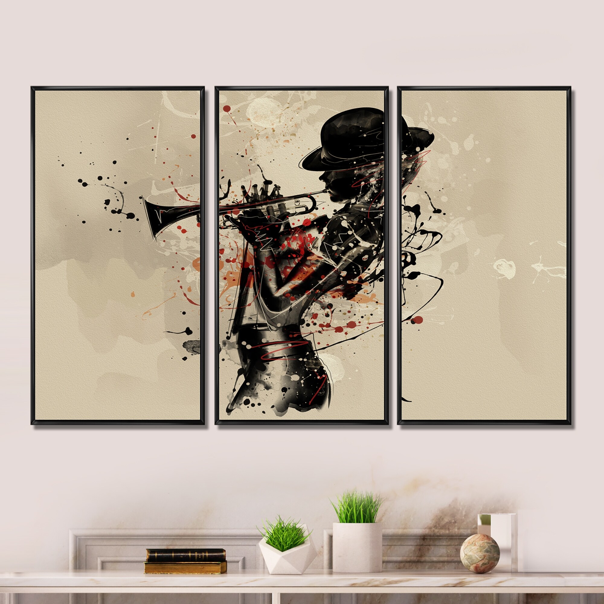Designart "Woman Playing Jazz Trumpet" Modern Framed Wall Art Set of 3 - 4 Colors of Frames