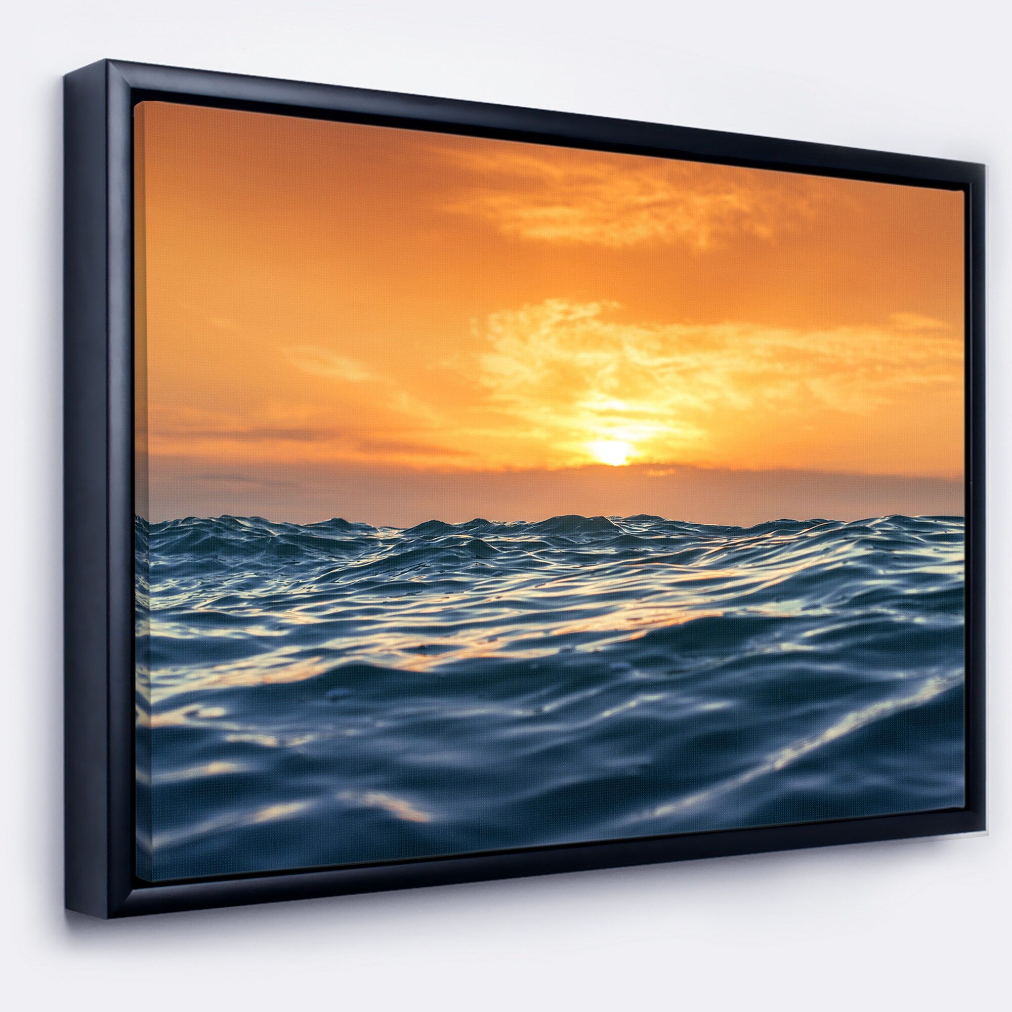 Designart "Blue Waves Dancing at Yellow Sunset" Beach Photo Framed Canvas Print