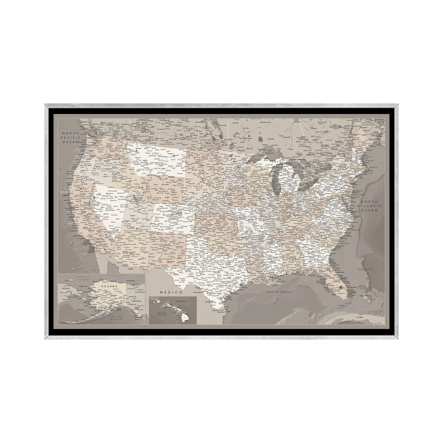 iCanvas "Detailed Brown Map of the Usa, Davey" by blursbyai Framed