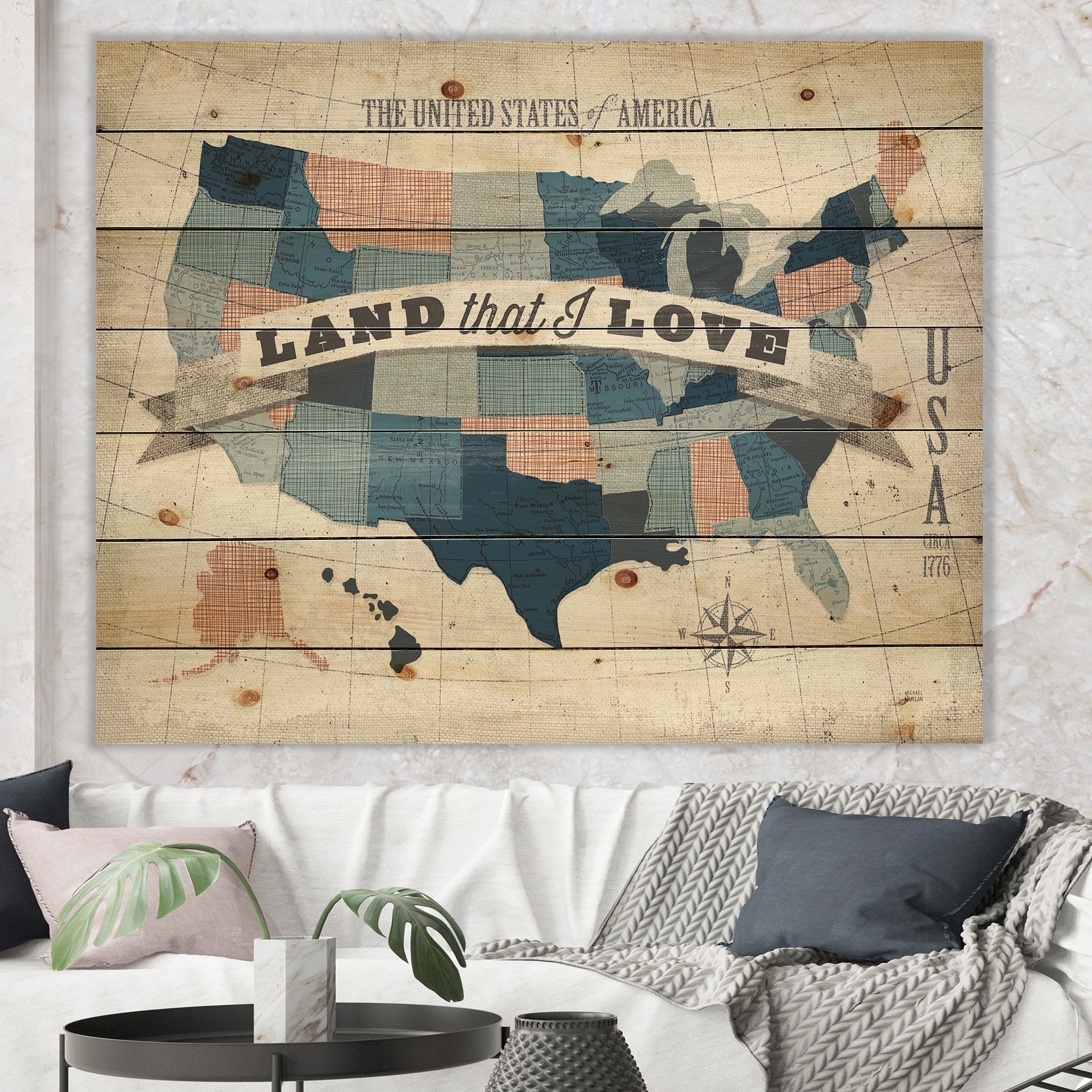 Designart 'American Map Watercolor' Map Print on Natural Pine Wood - Blue