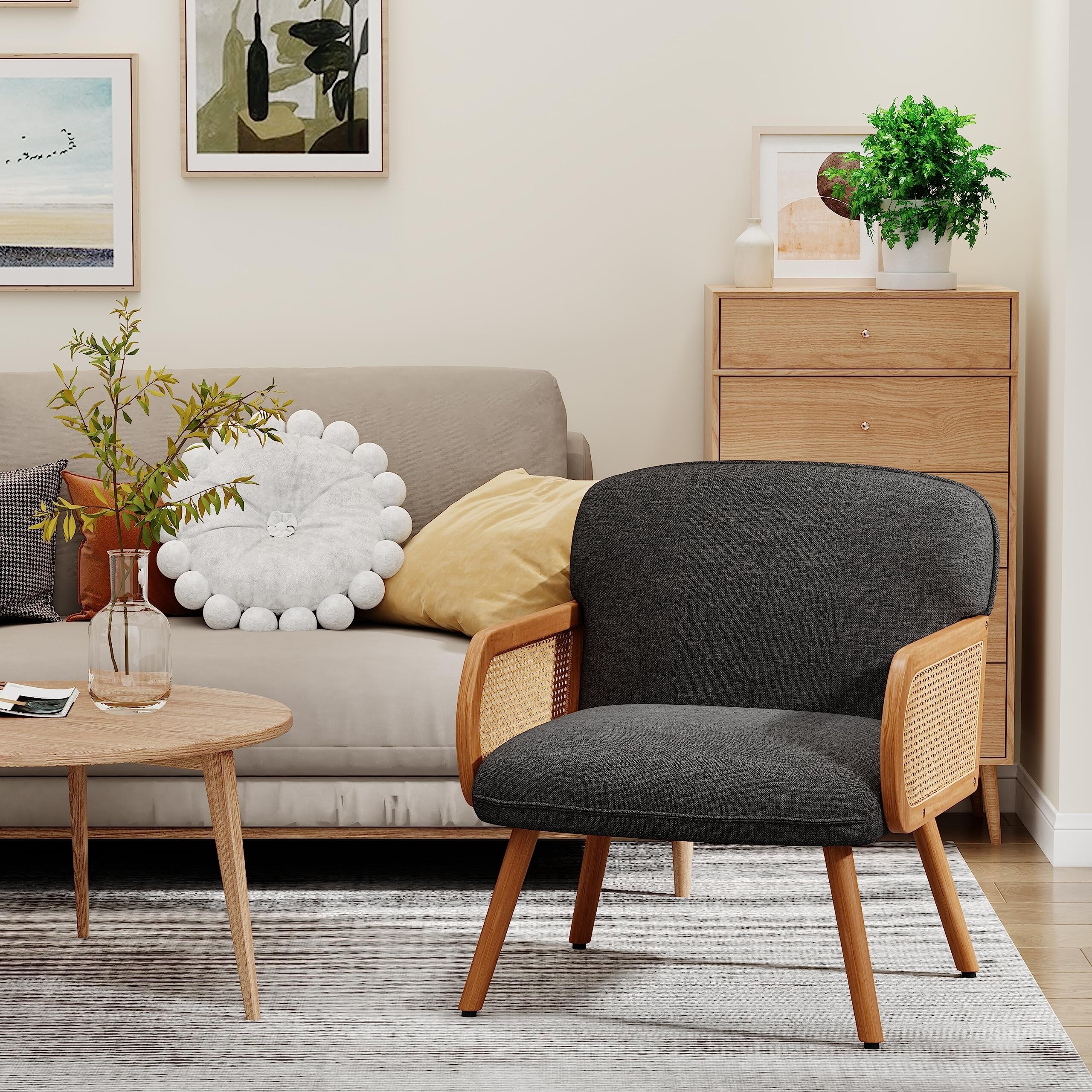 Accent Chair with Rattan Arms,Upholstered Mid Century Modern Living Room Armchair, Side Club Chair with Burlap Linen Fabric