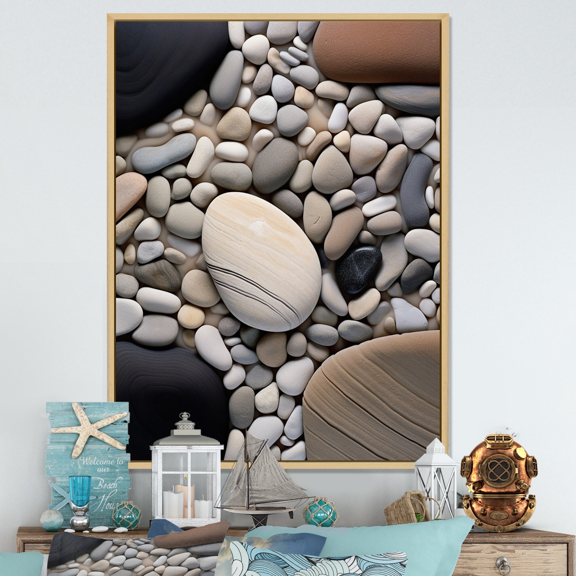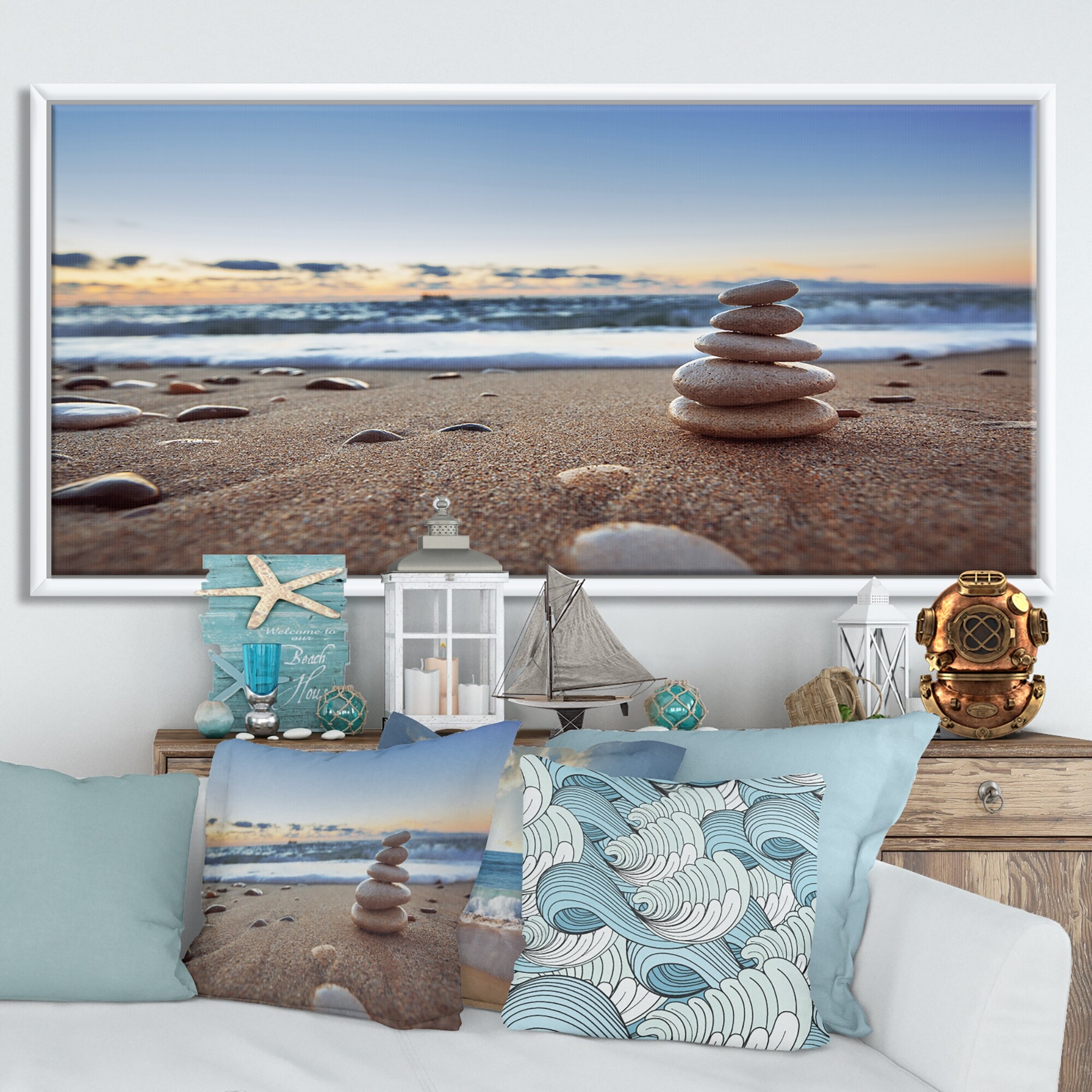 Designart "Stones Balance on Sandy Beach" Seashore Framed Canvas Art Print