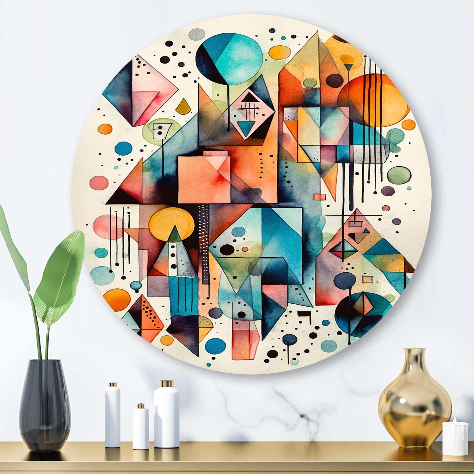 Designart "Blue And Orange Geometry Balance I" Modern Geometric Metal Round Wall Art