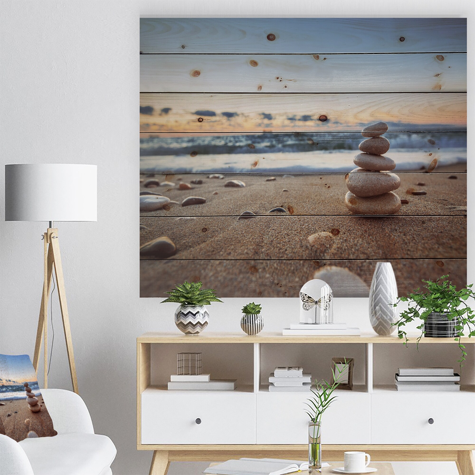 Designart 'Stones Balance on Sandy Beach' Seashore Print on Natural Pine Wood - Brown