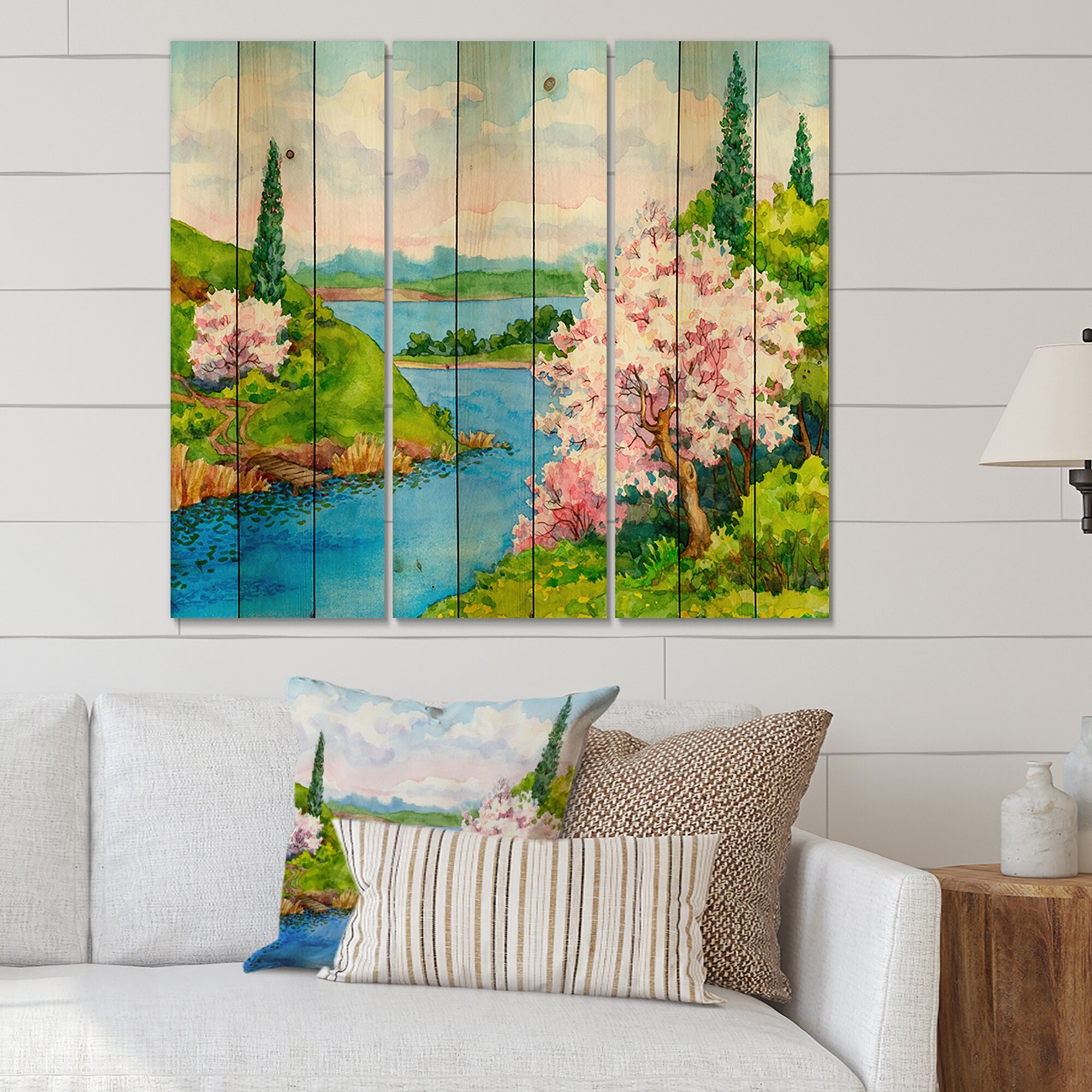 Designart 'Spring Landscape Under A Bright Blue Sky' Traditional Print on Natural Pine Wood - 3 Panels