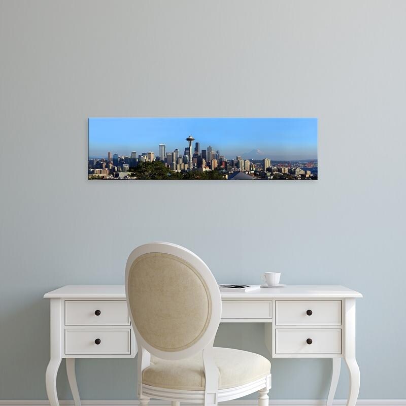Easy Art Prints Panoramic Image 'City with mountains, Space Needle, Mt Rainier, Seattle, Washington' Canvas Art