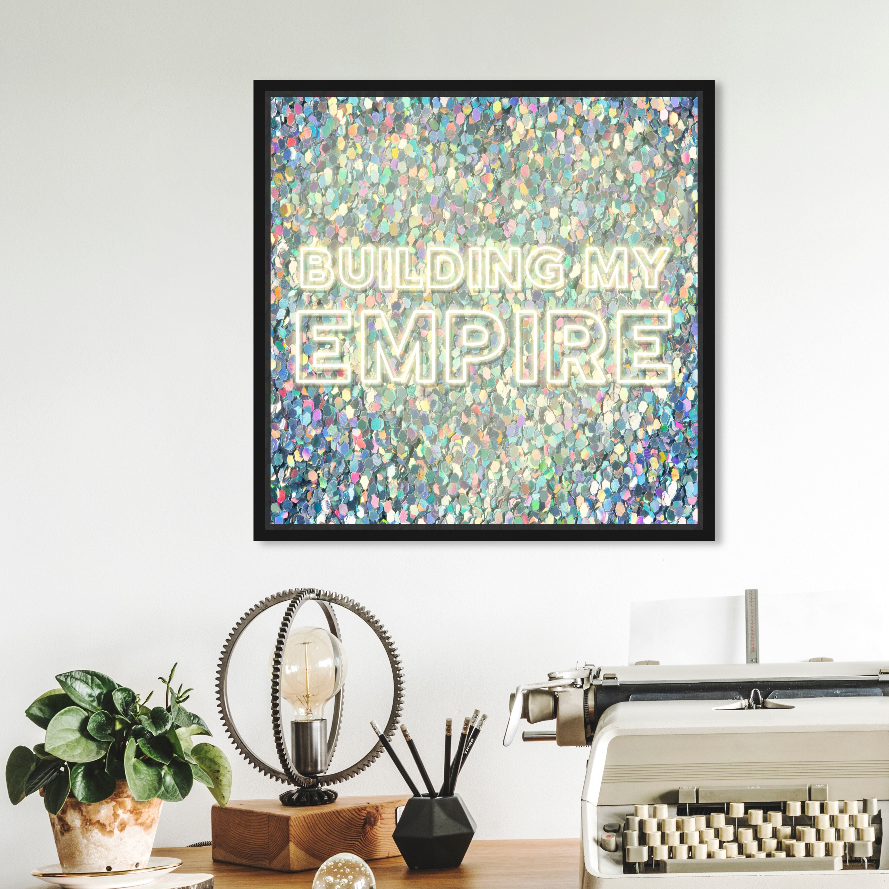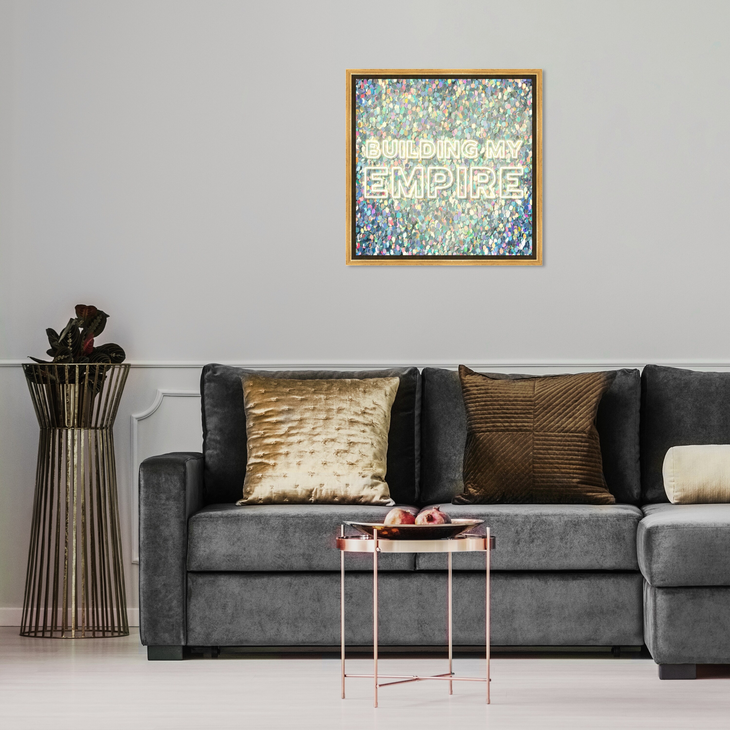 Oliver Gal 'Building My Empire Neon' Typography and Quotes Wall Art Framed Canvas Print Quotes and Sayings - Gold, Blue