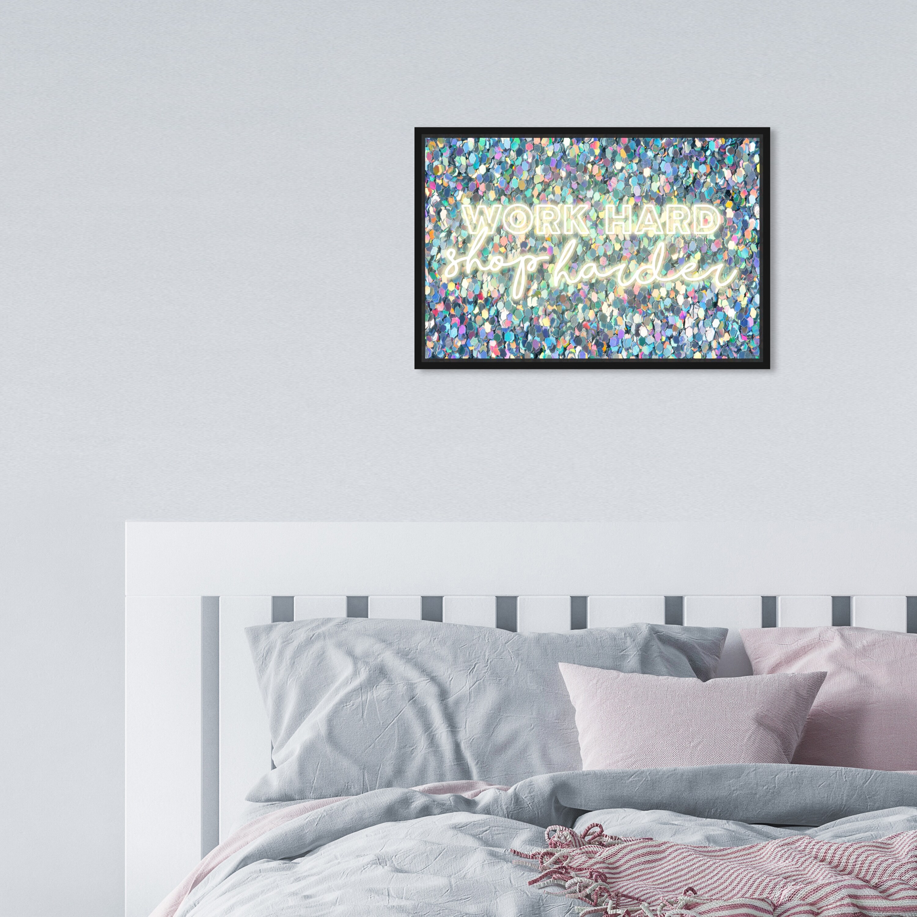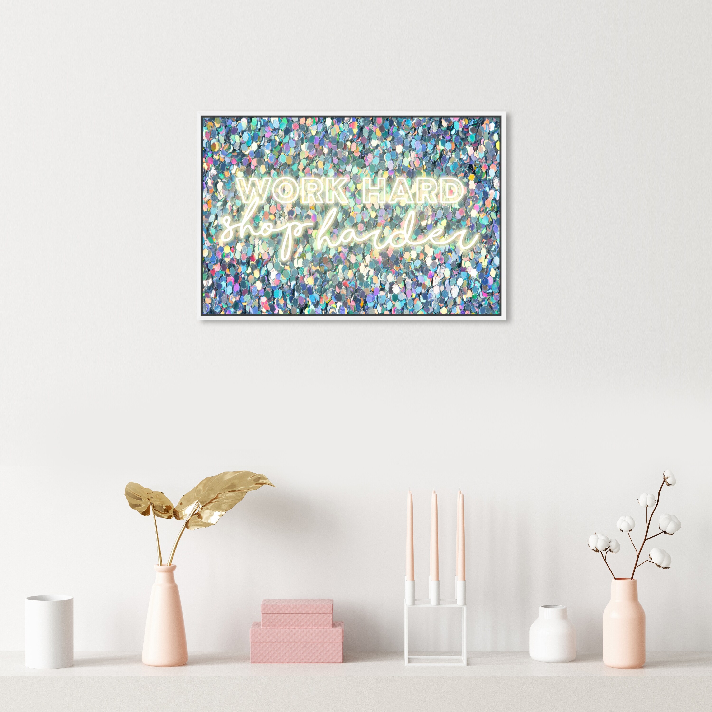 Oliver Gal 'Shop Harder Neon' Typography and Quotes Wall Art Framed Canvas Print Motivational Quotes and Sayings - Blue, White