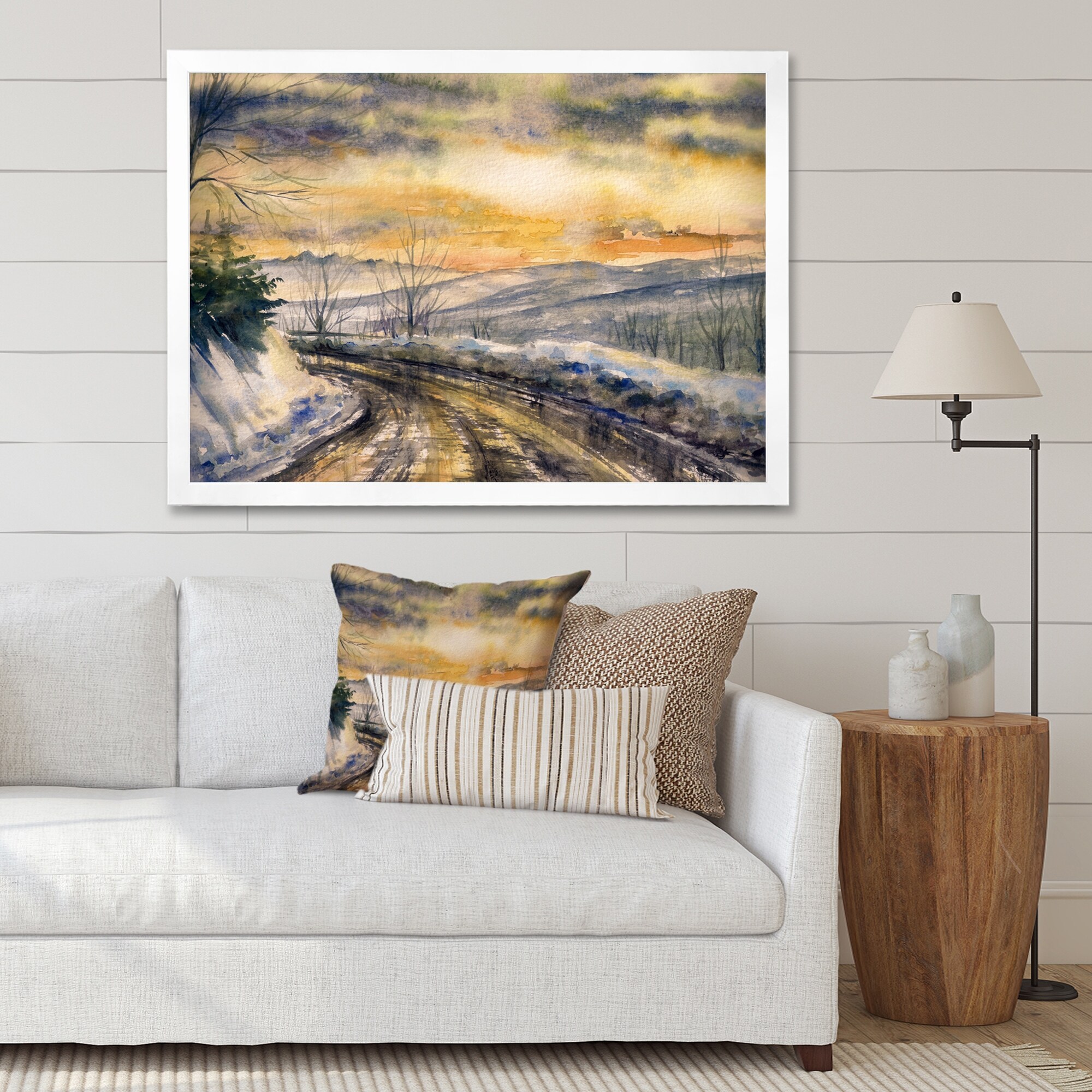 Designart "Snowy Road Through Winter Landscape II" Country Framed Art Print
