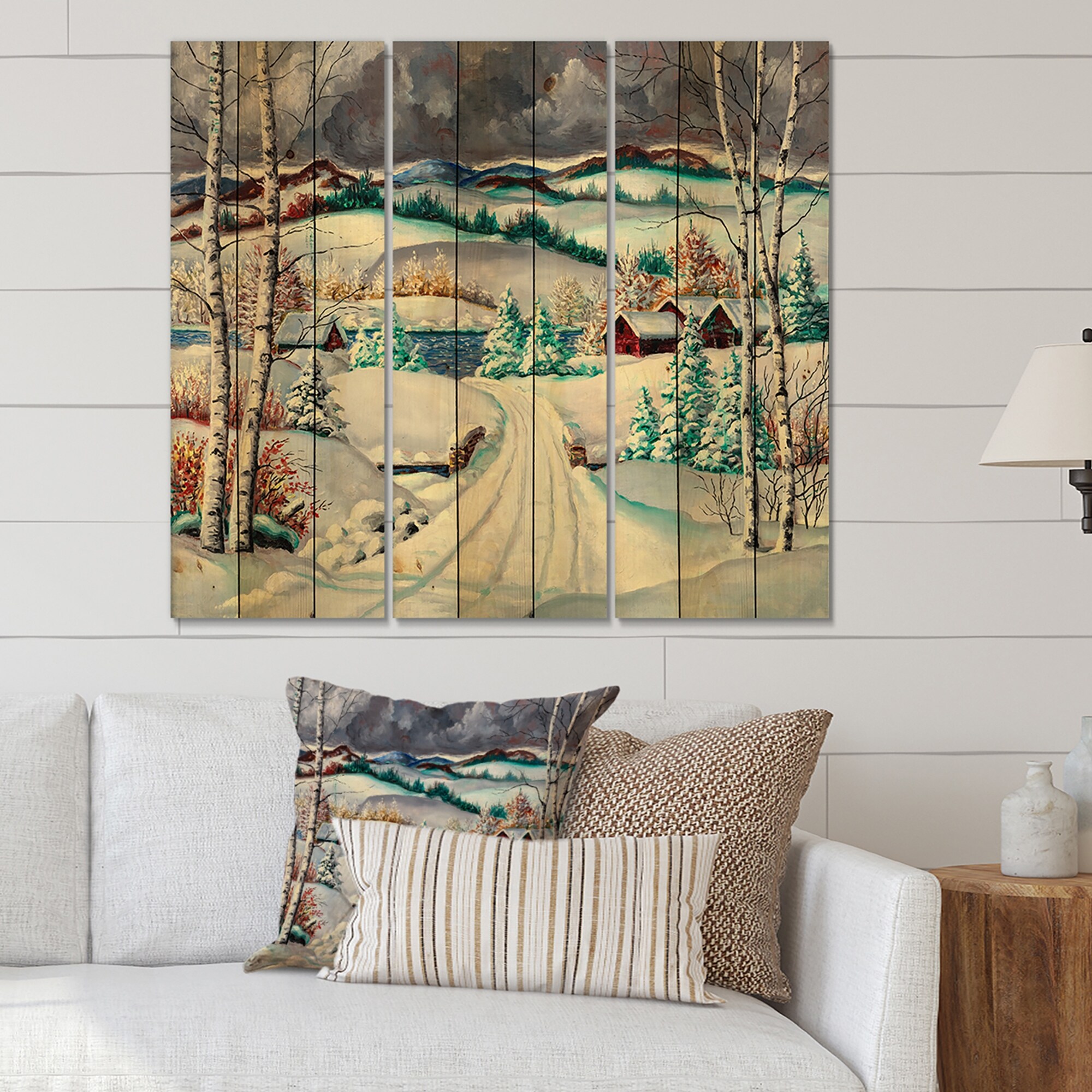 Designart 'Snowy Road in Rural Winter Landscape' Traditional Print on Natural Pine Wood - 3 Panels