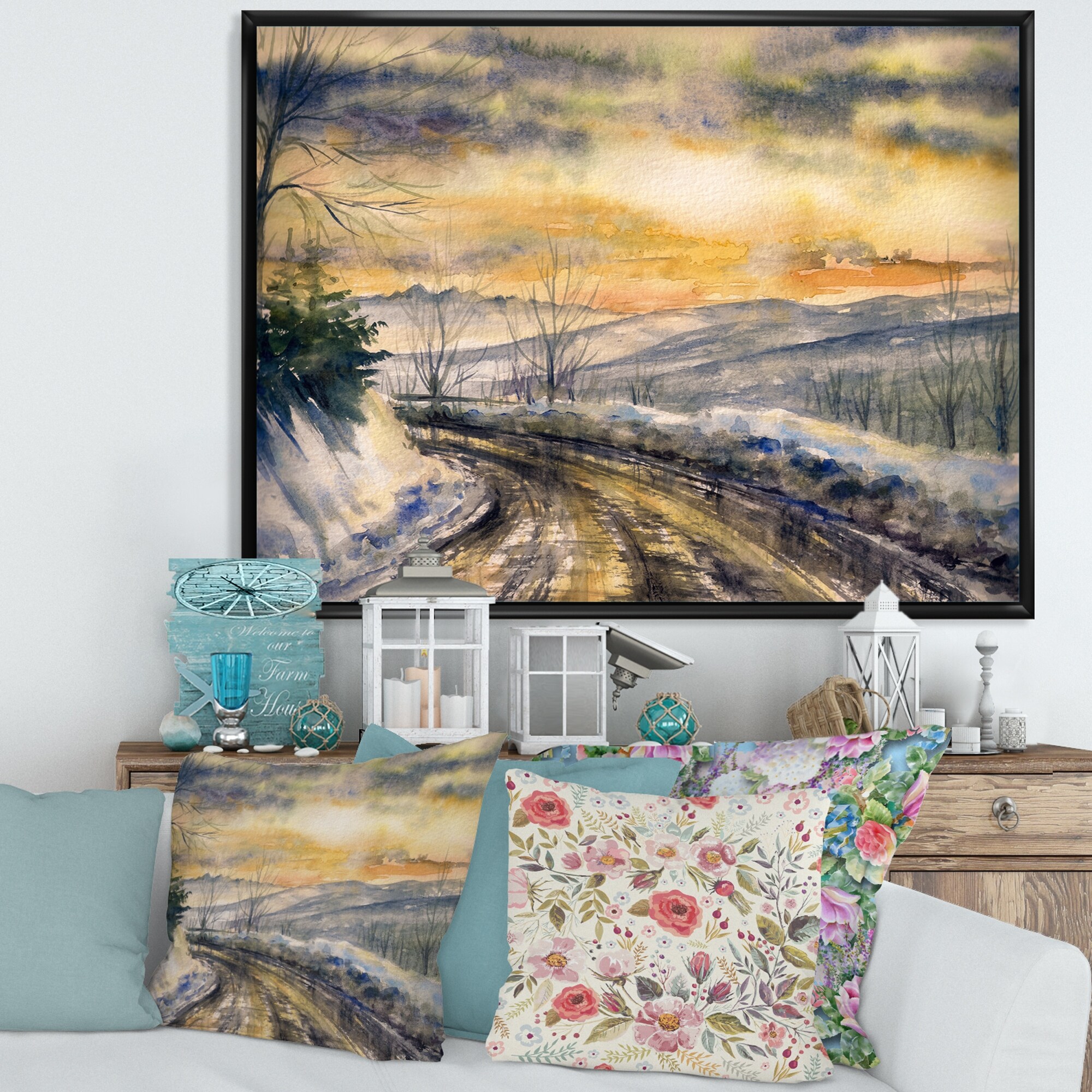 Designart "Snowy Road Through Winter Landscape II" Country Framed Canvas Wall Art Print