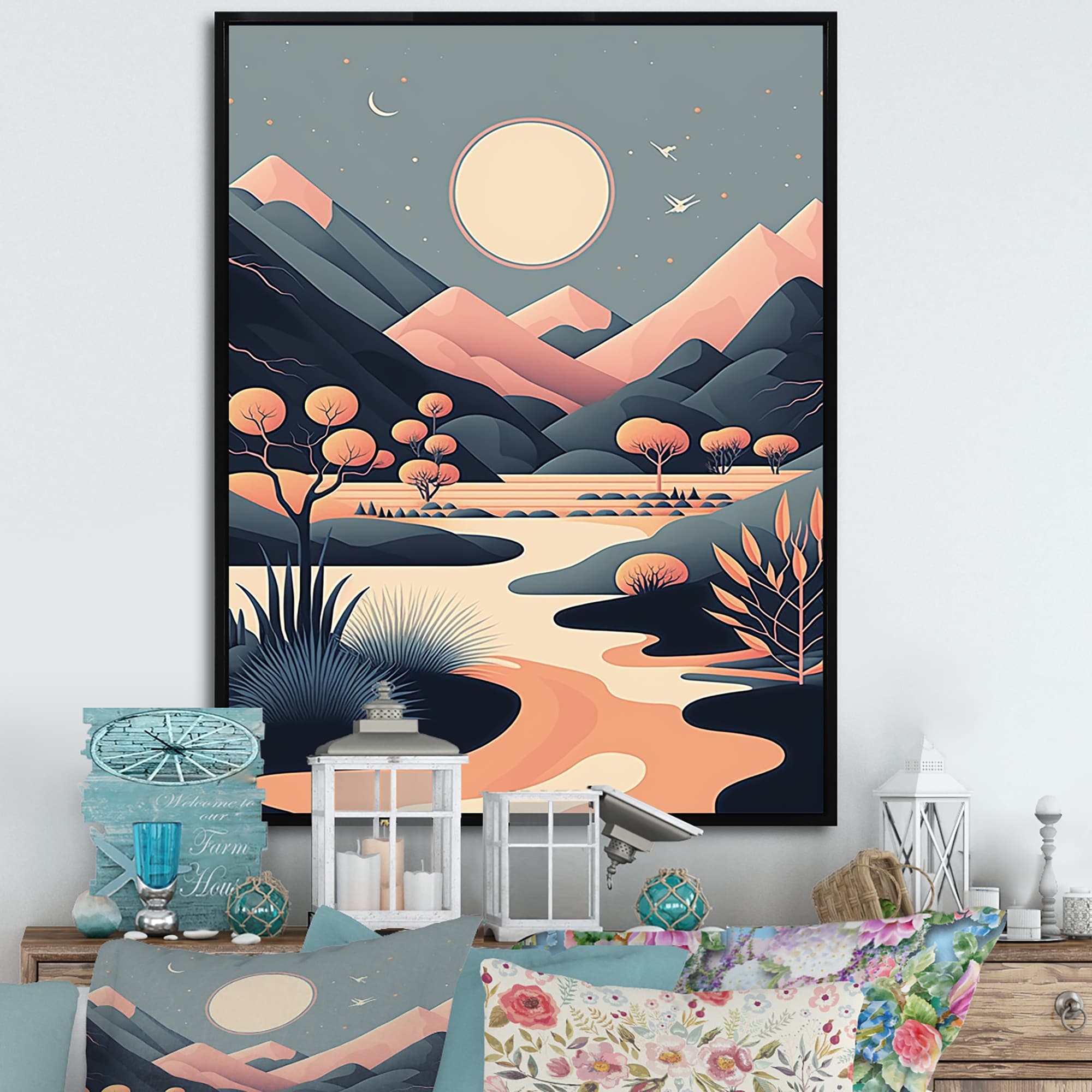 Designart "Graphic Mountain Trees in Pink And Blue I" Landscape Mountains Framed Canvas Wall Art Print