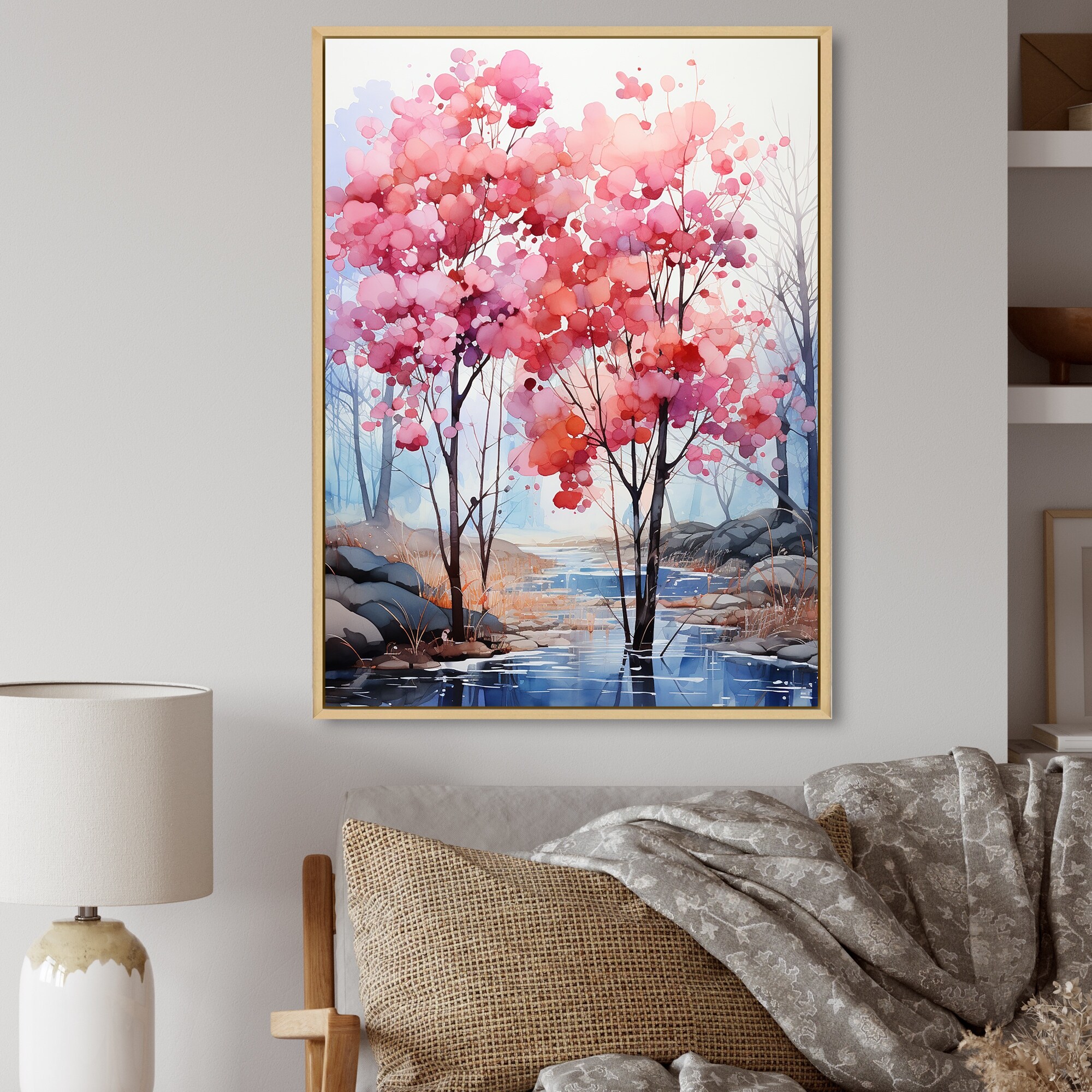 Designart "Pink And Blue Trees Field Pointillism V" Landscape Trees Framed Canvas Wall Art