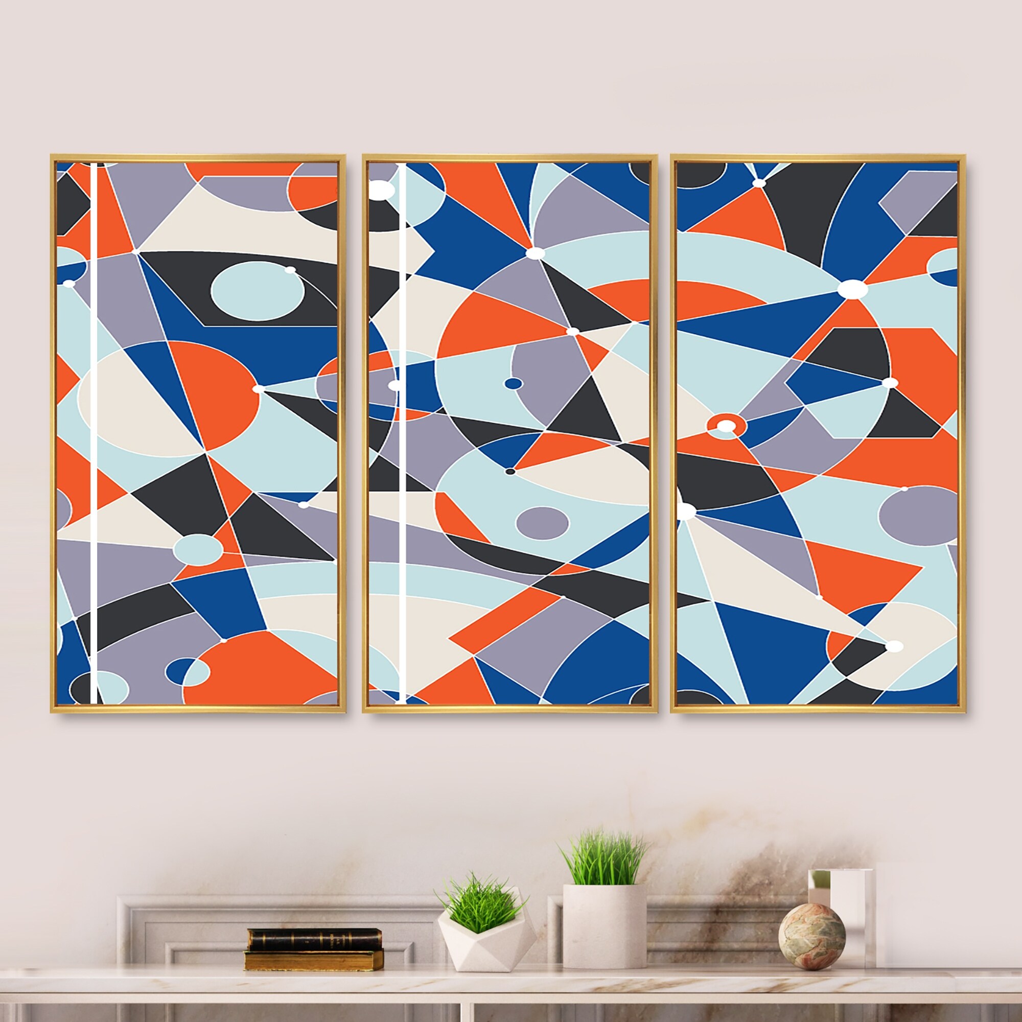 Designart "Retro Geometric Grid IV" Mid-Century Modern Framed Canvas Wall Art Print Set of 3 - 4 Colors of Frames
